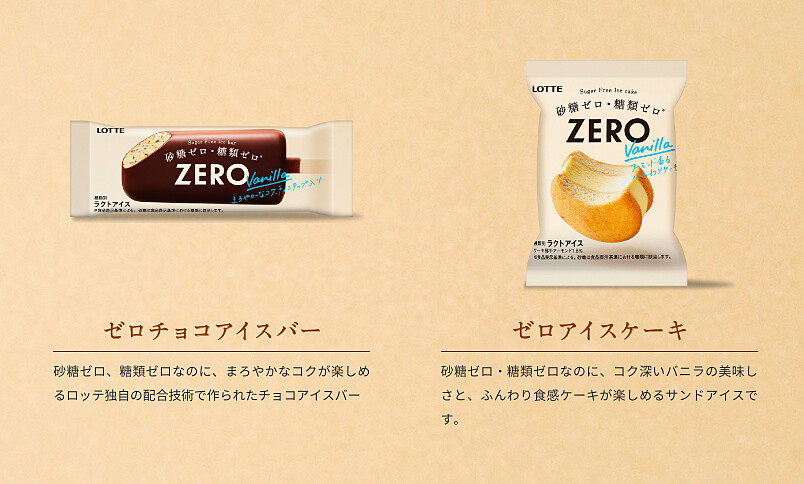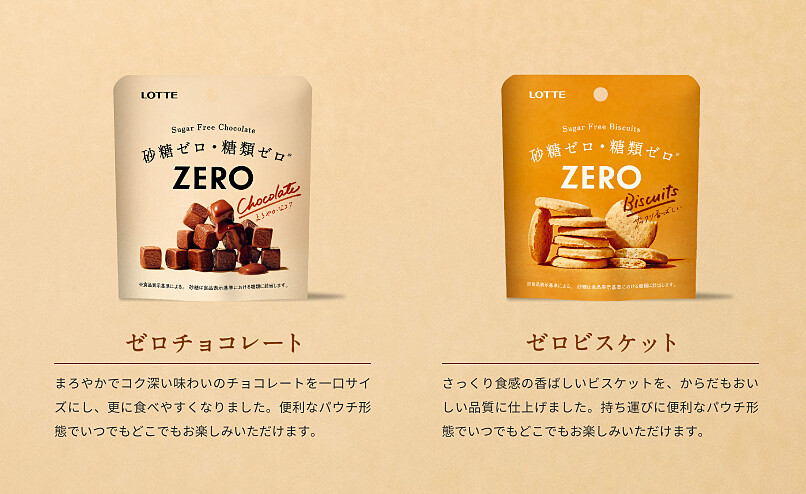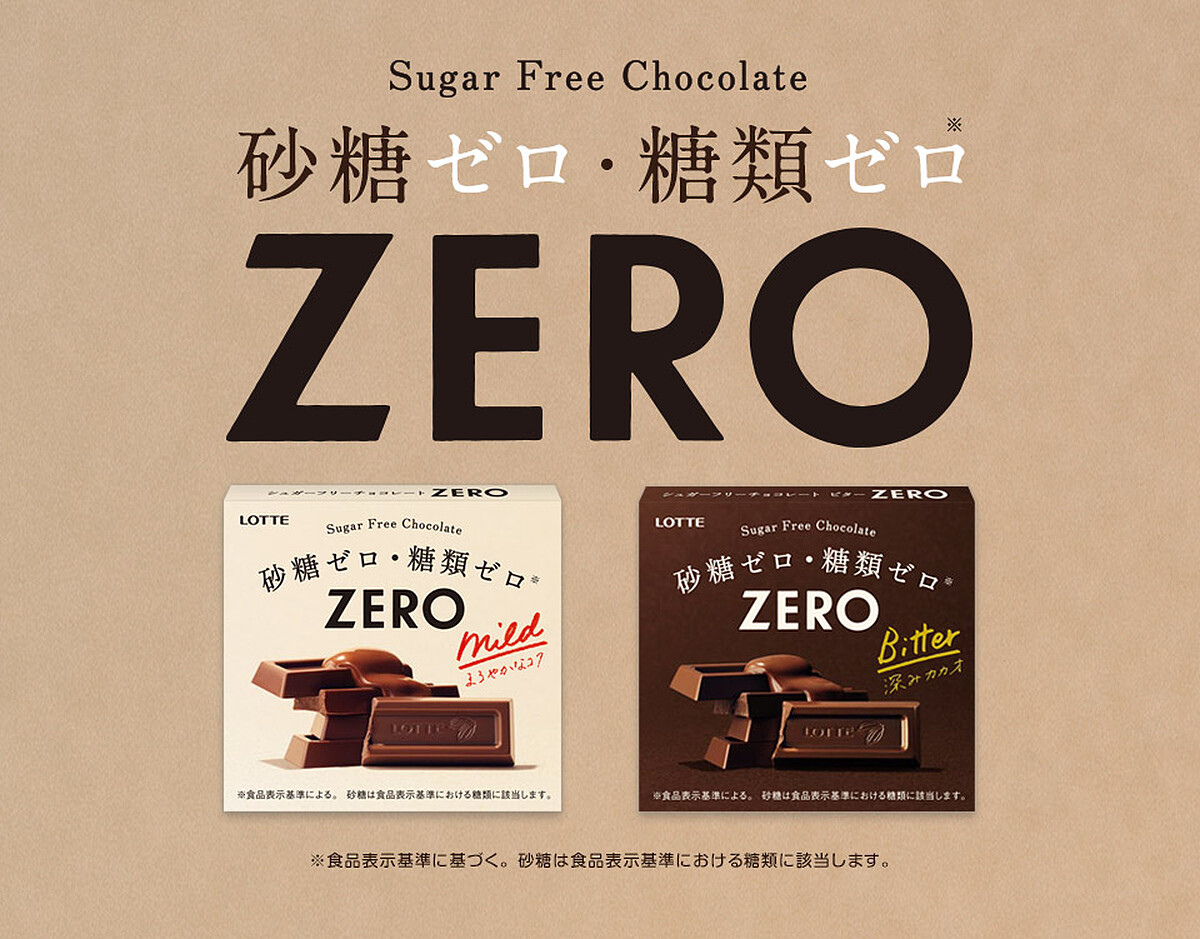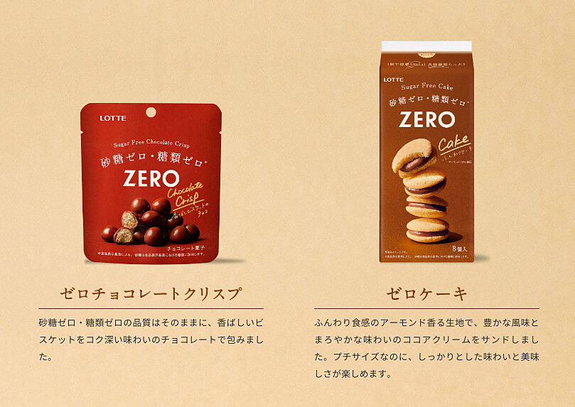 日本市場上充斥著許多「機能性」的巧克力,樂天LOTTE旗下「ZERO零糖」系列甜點,從巧克力、巧克力夾心蛋糕、餅乾應有盡有,全都符合每100克食品中,含糖量少於0.5克的「無糖」標準。