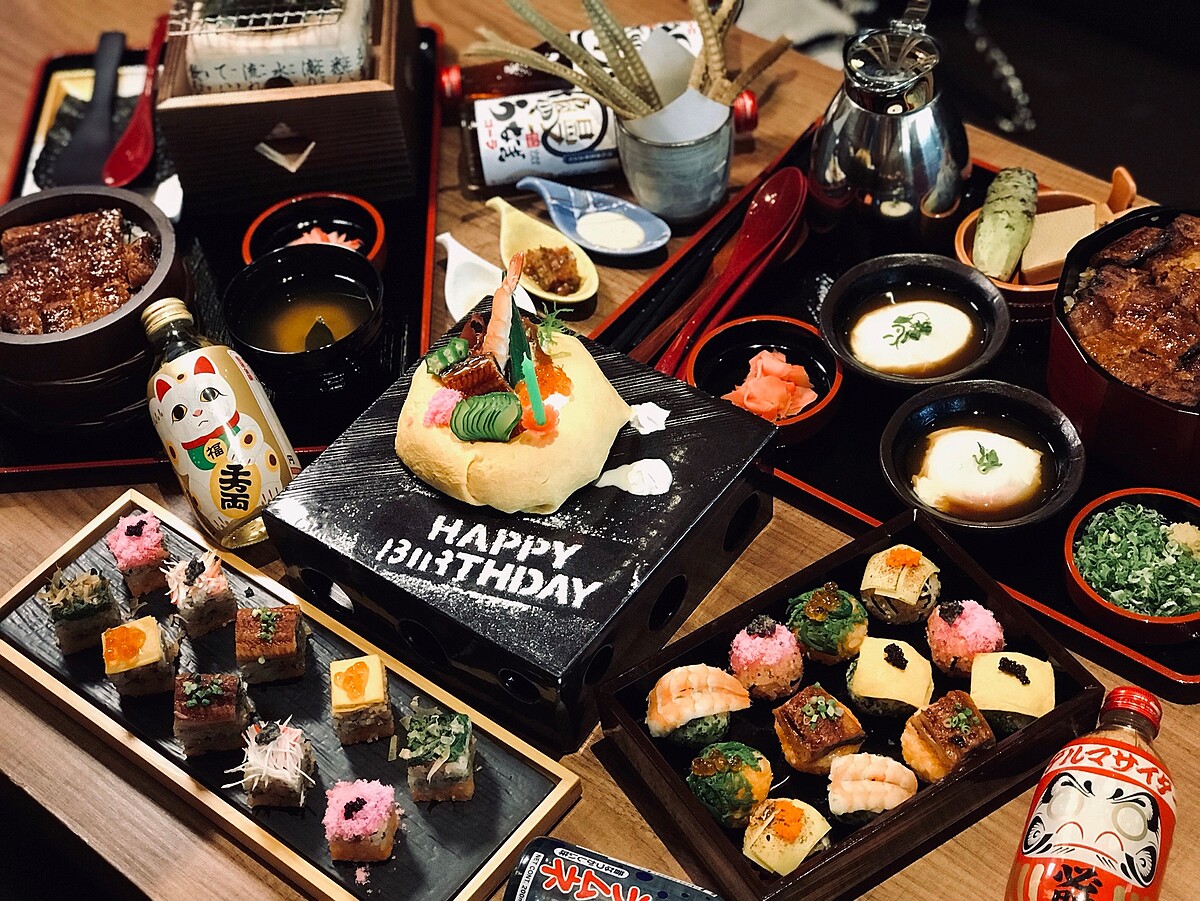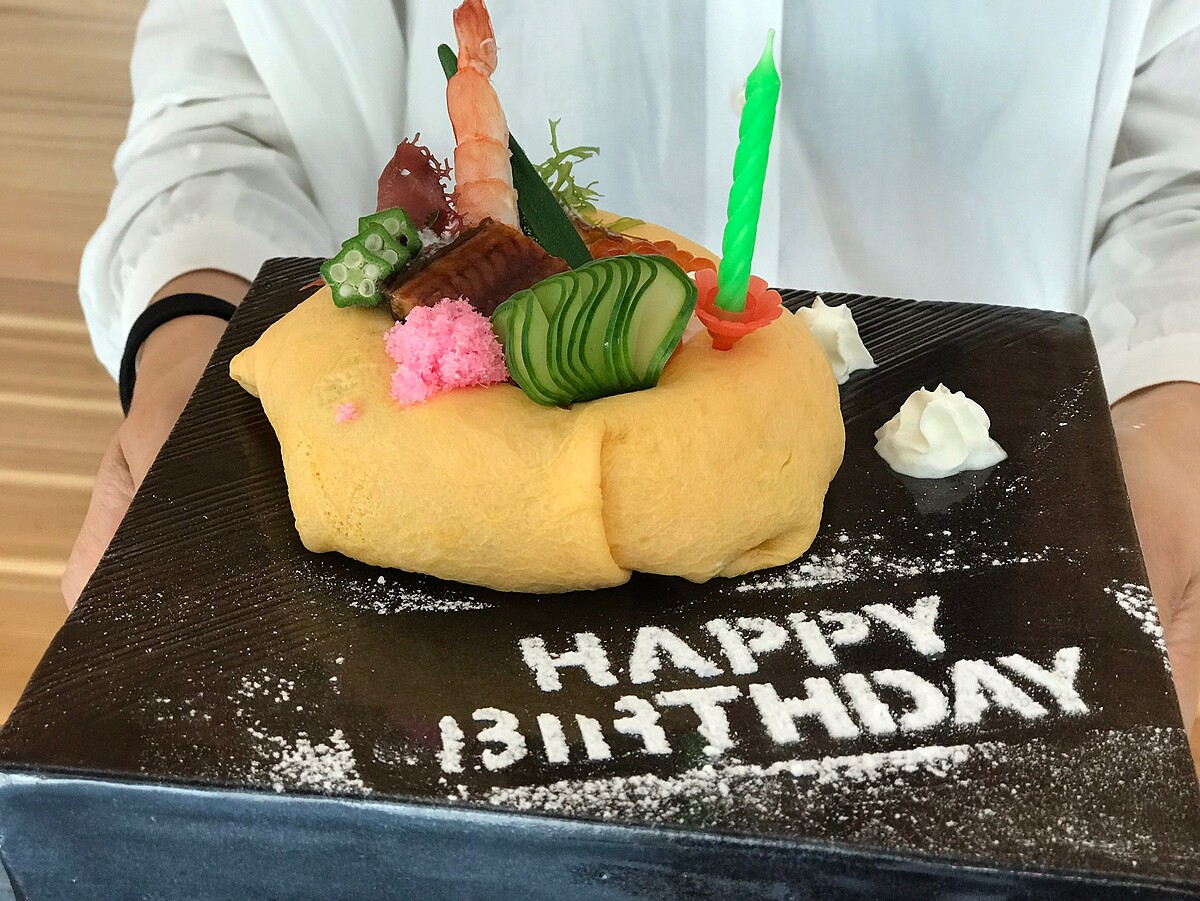 生日的壽星在《無敵一家鰻や》當月也能免費獲得鰻魚壽司蛋糕,蛋糕內餡是由醋飯捏成甜甜圈外型,最外層的金黃色蛋皮,最上方再接著放入蒲燒鰻魚、鮮蝦等不同⻝材,即使不是生日期間,這道料理也是讓人食指大動。