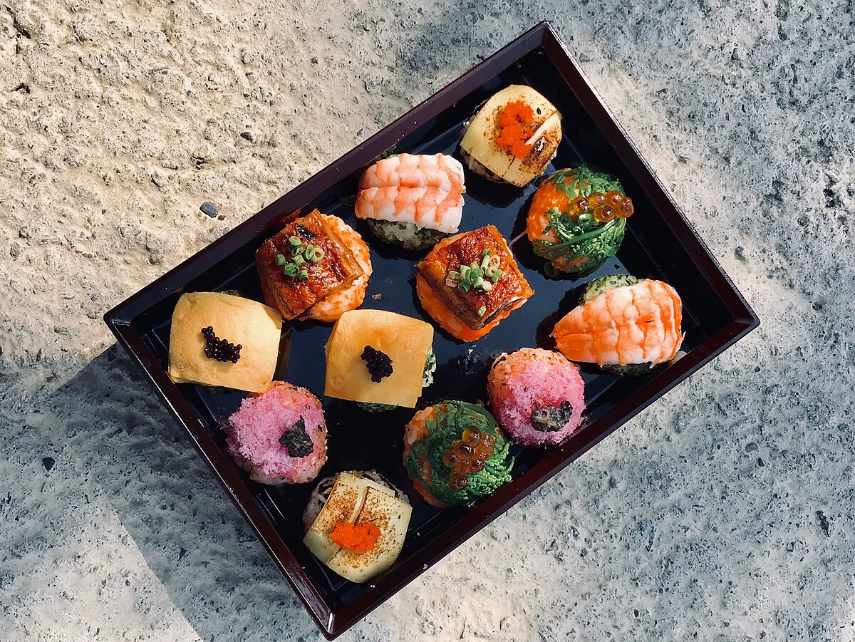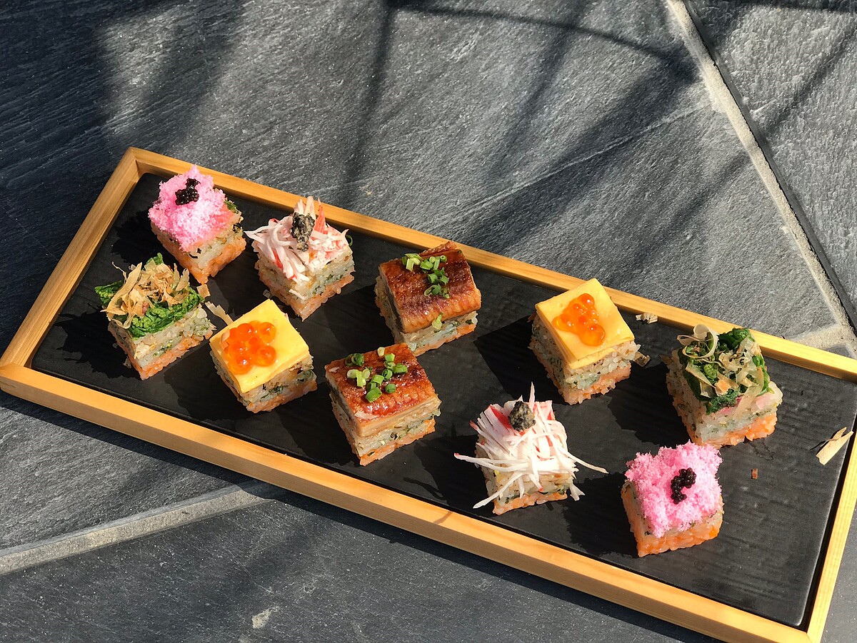 「手毬壽司」外型相較於一般壽司來的小,據說是為了讓藝伎享用但不會弄花妝容的設計, 將醋飯搓捏成圓球,最上方放上蒲燒鰻、山掘菜、壽司蝦等配料,一顆顆擁有小巧玲瓏圓滾滾的外觀,不僅超好拍也很好吃!