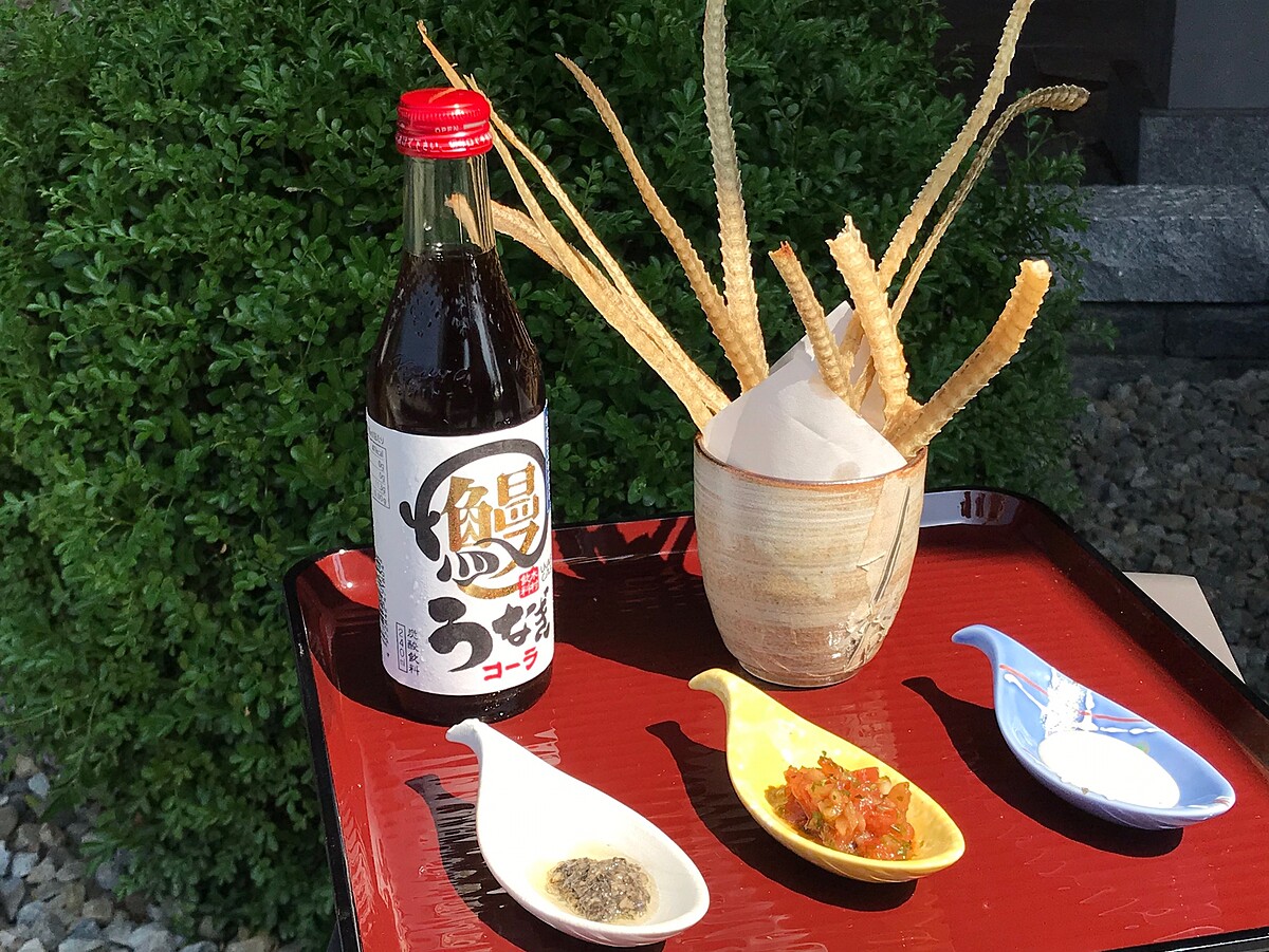 將現殺鰻魚取出骨頭,經過自然風乾3天後酥炸,酥脆的魚骨在品嚐時,可沾上凱撒沙拉醬、黑松露醬、莎莎醬,濃厚的魚骨風味搭配不同醬汁,三種風味一次滿足~也建議您與進口自日本的「鰻魚可樂」一同搭配,以薯條配可樂的概念,吃得有味更健康!