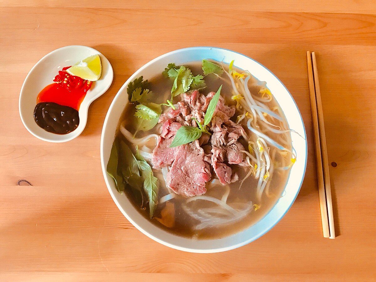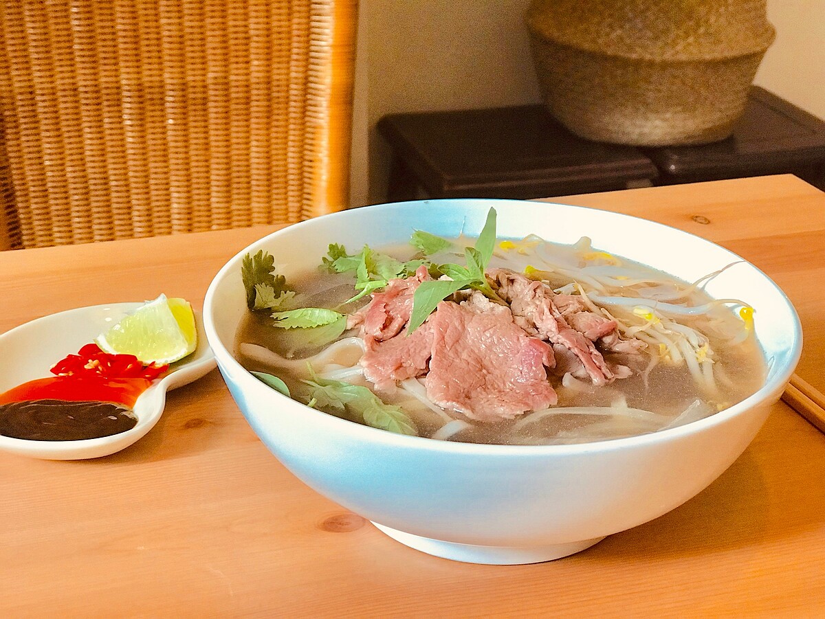 湯底使用牛骨精燉,精心費時熬煮而成,使用濃郁的高溫高湯淋在生牛肉上,讓牛肉隨著高湯逐漸變熟,直接品嘗牛肉的軟嫩口感,也可以沾取越式海鮮醬、辣醬感受不同的風味!