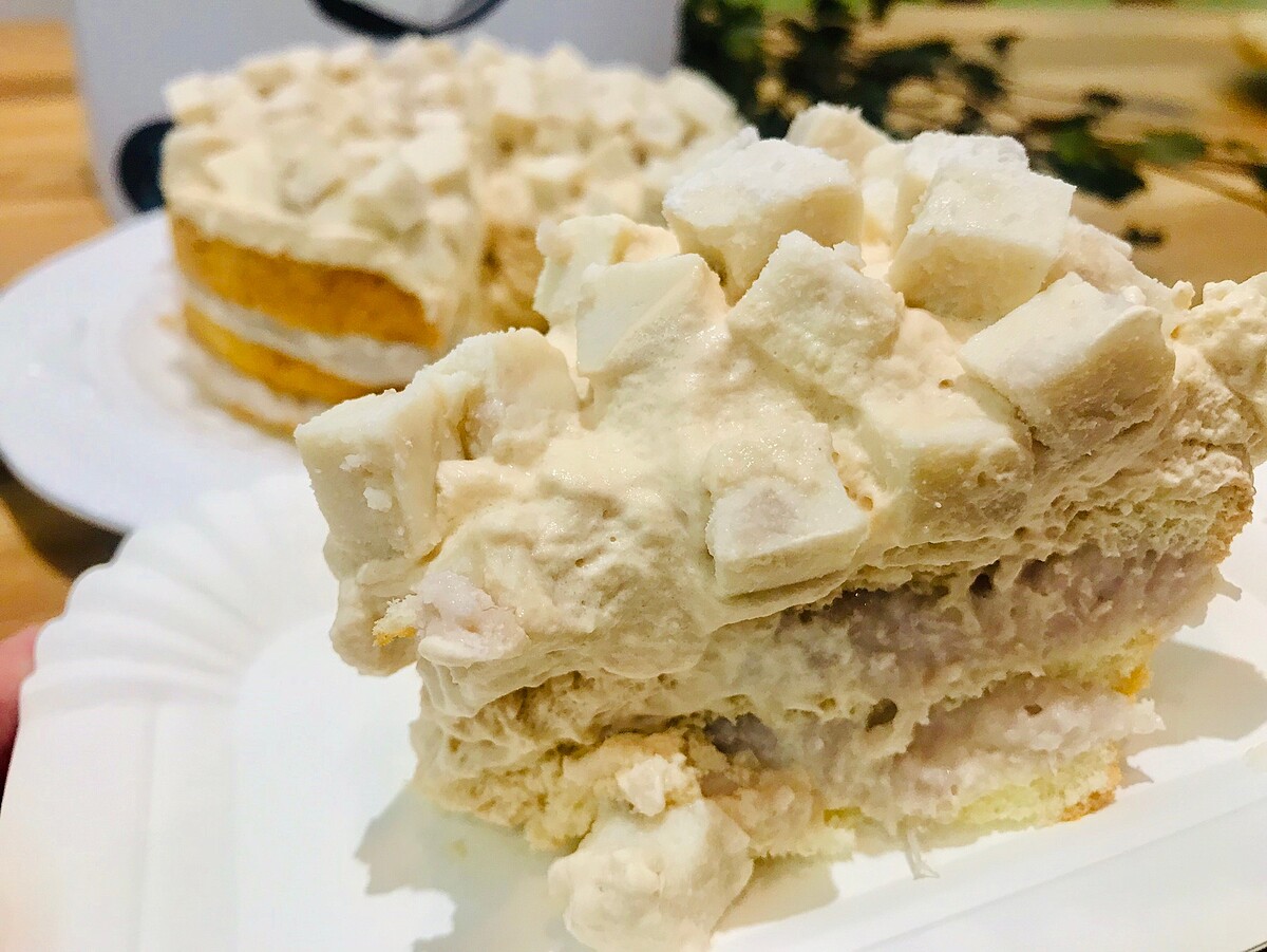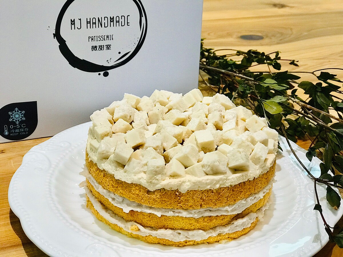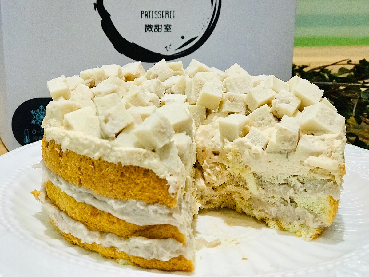蛋糕本體選用鮮奶製成牛奶戚風,再夾入英式紅茶奶霜及芋泥,最上方放上芋頭奶凍作為點綴。