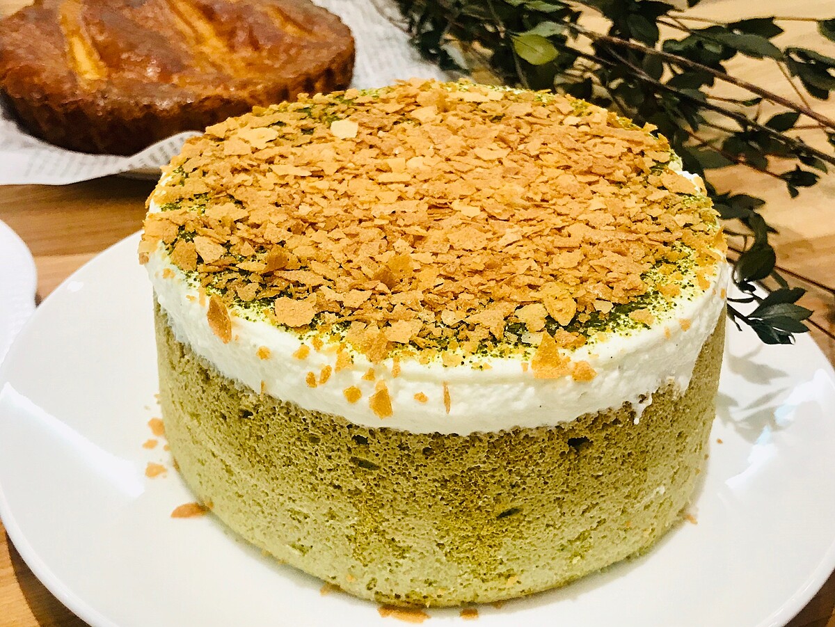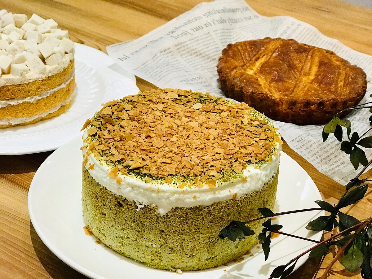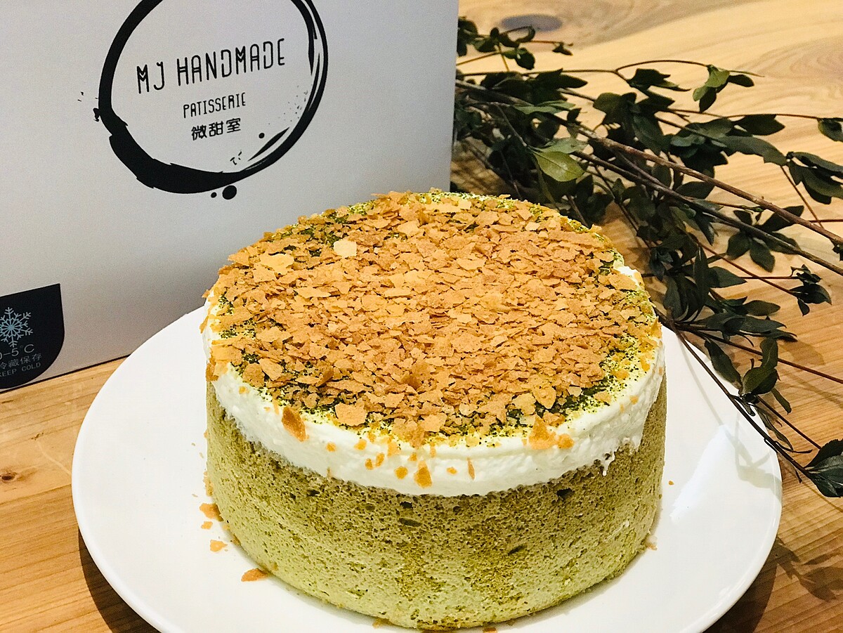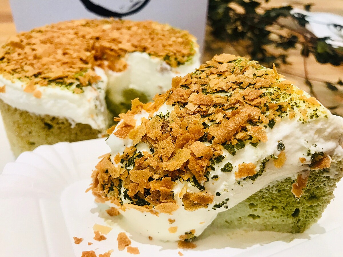以頂級抹茶粉製成鬆軟的抹茶戚風蛋糕,在使用再以香草籽、法國鐵塔奶油及法芙娜白巧克力融合製成香草百巧奶霜後,將流動的奶霜灌入蛋糕內層後,再覆蓋至蛋糕上方後!