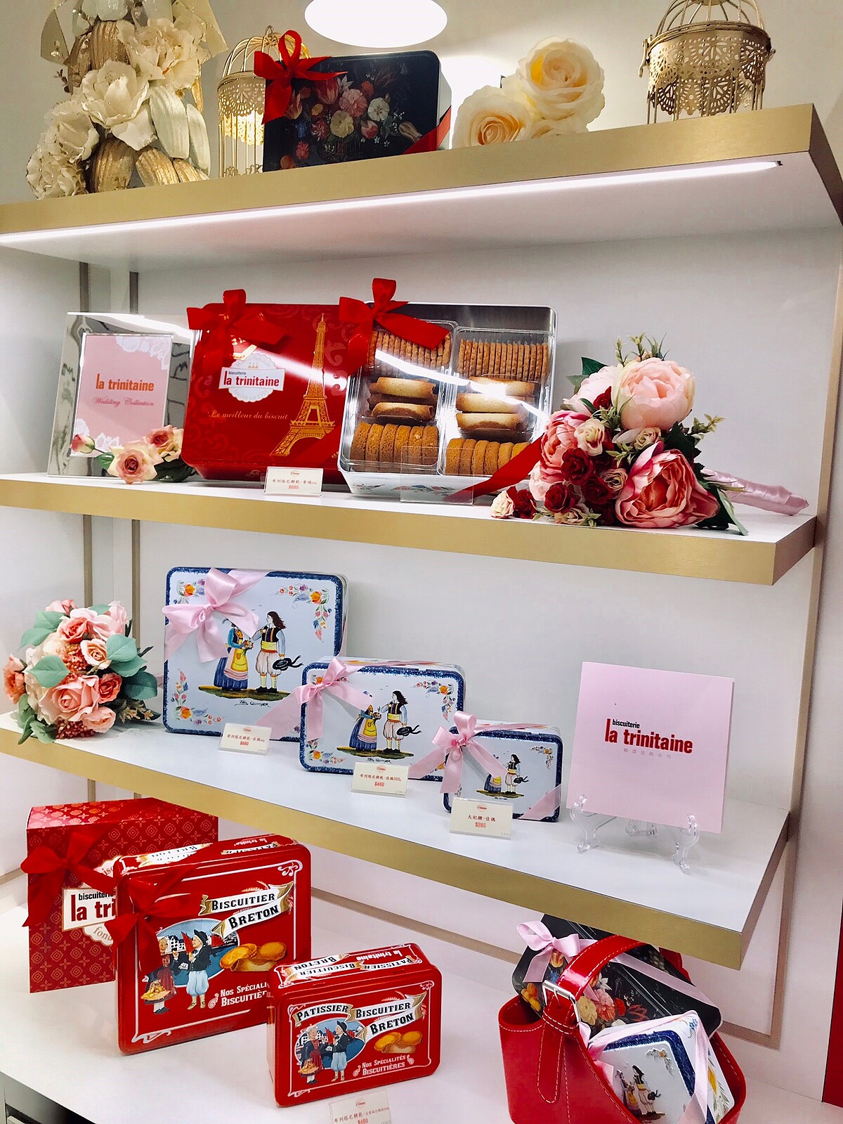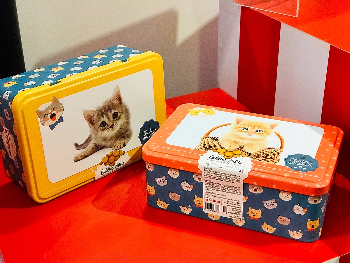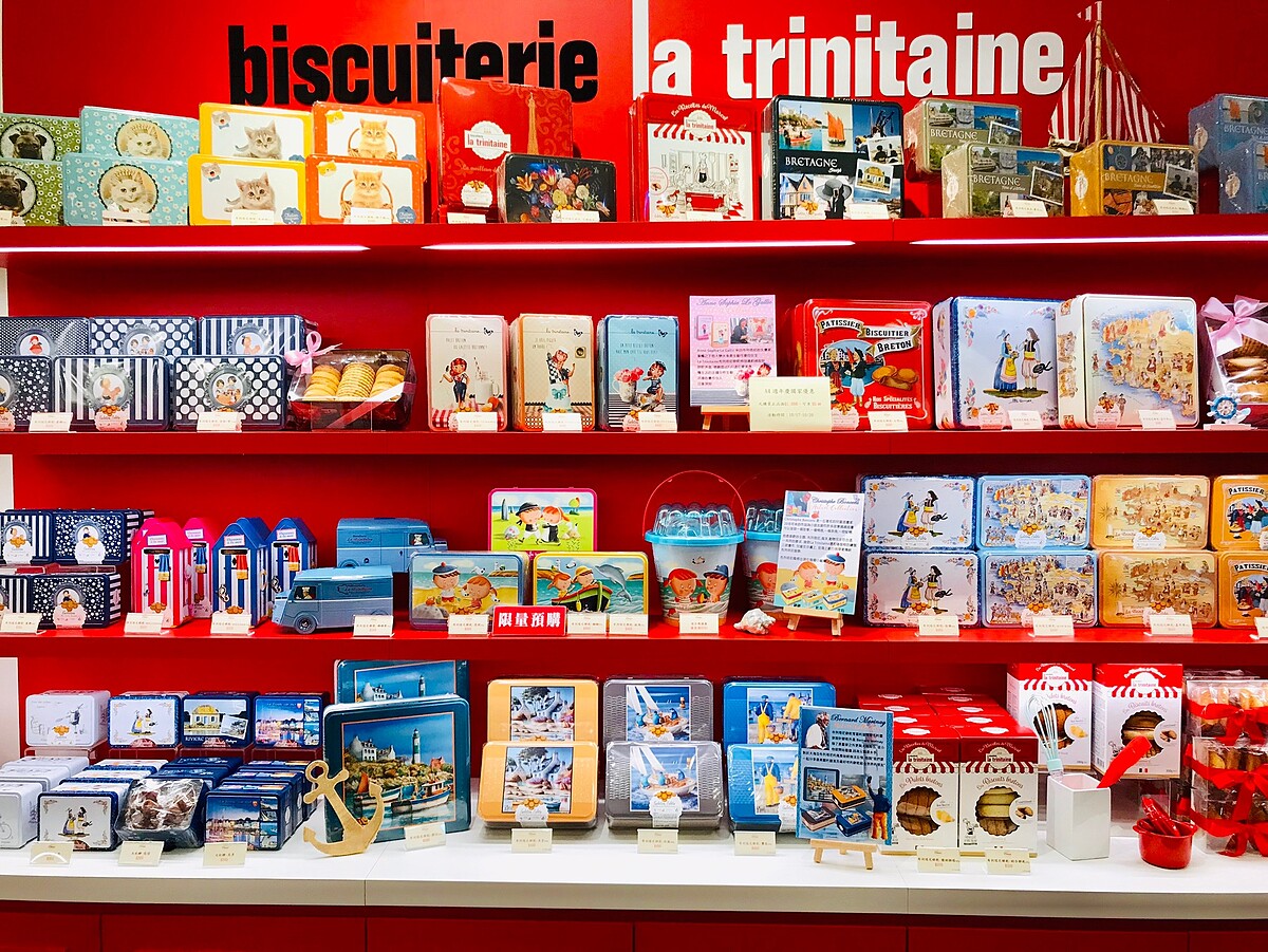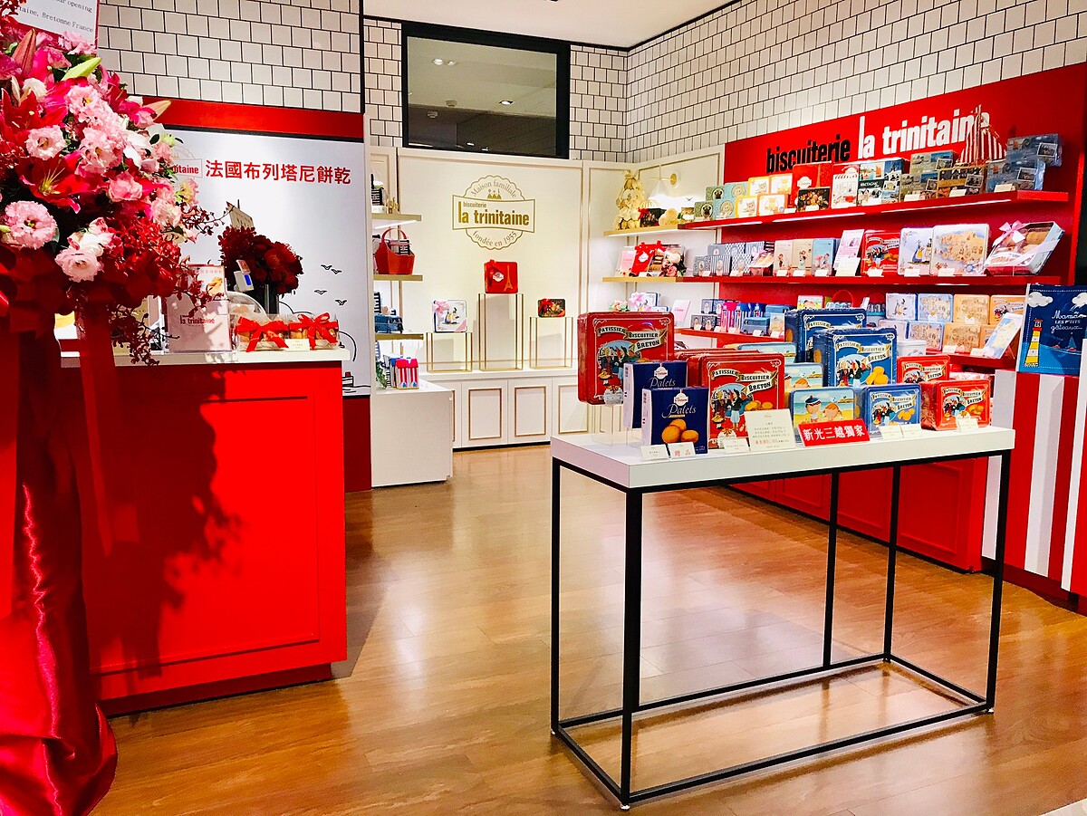 法國「La trinitaine布列塔尼酥餅」於今年8月在SOGO復興館設立了亞洲第一間店,第二間店則進駐信義區新光三越,此店擁有五大陳列專區像是婚盟區、彌月區、主題活動區、用品區、各式禮盒區,擁有多樣化的送禮選則。店面使用「紅、黑、金、白」四個顏色,打造出高貴不貴的氛圍,並使用印有「馬歇爾主廚」的圖樣,更增添了趣味性。