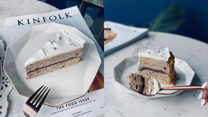 這款「青梅千層蛋糕」將青梅果醬與果粒融入千層中,使用超過200顆青梅打造一整顆千層,用料相當實在,青梅的酸加上鮮奶油的甜味,讓酸甜達到完美平衡,入口相當清爽不膩,上頭再撒上銀箔巧克力裝飾,營造出充滿星空幻想的華麗感,與台中歌劇院的藝文調性意外合拍。