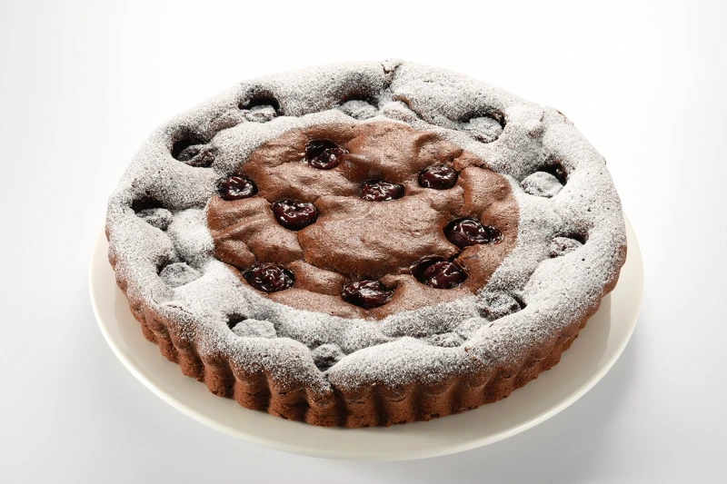 新品「櫻桃巧克力派」以醇厚微苦的古典巧克力為基礎,再選用完整的糖漬櫻桃果肉一起烘烤,整體口感屬於濃厚中帶有清爽的櫻桃果酸甜味,在口中逐漸化開的巧克力內餡夾帶果粒!