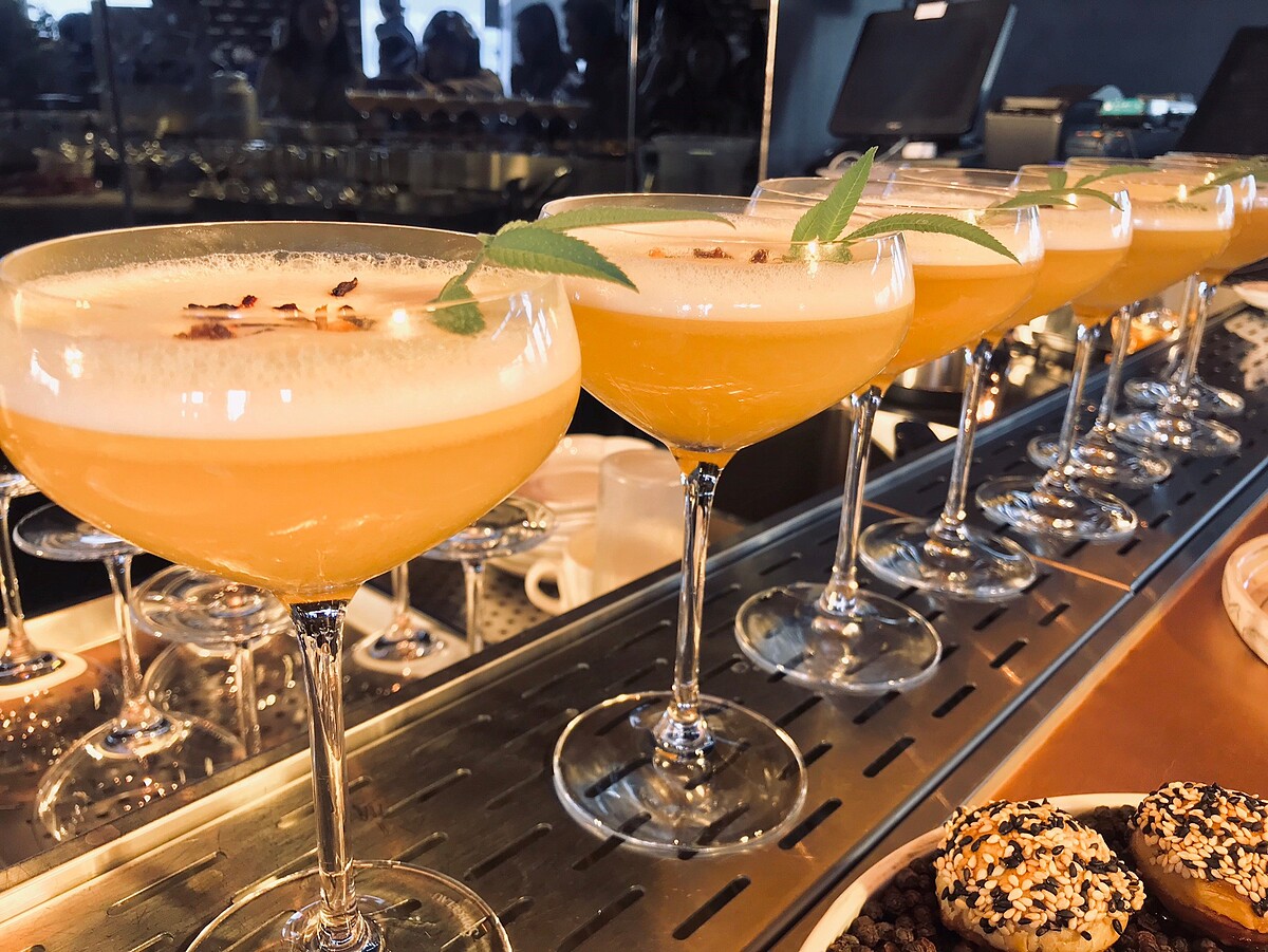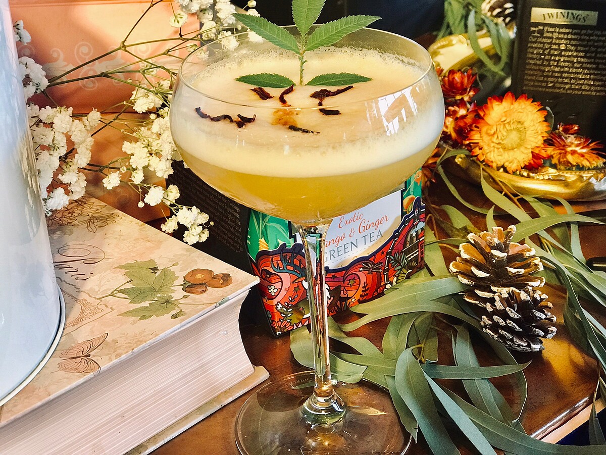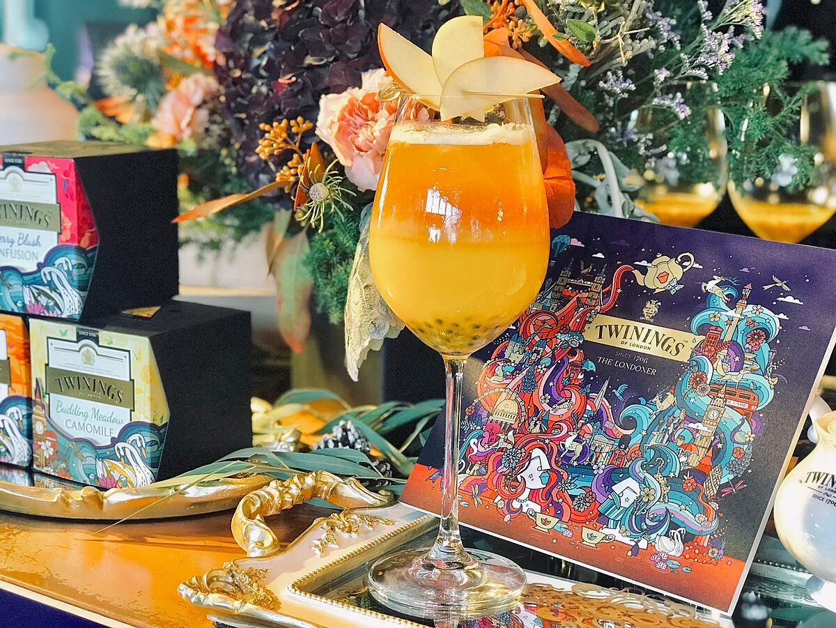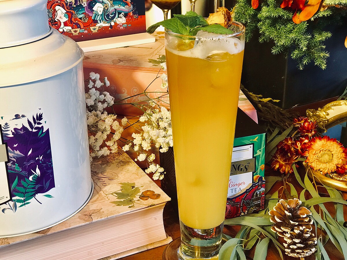 以唐寧茶鉑金系列薑芒綠茶狂想曲為基底茶,加上百香果泥及蘋果汁製作而成,最上方灑上玫瑰及薄荷葉裝飾!