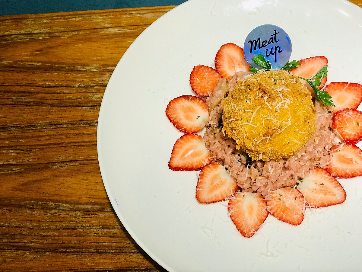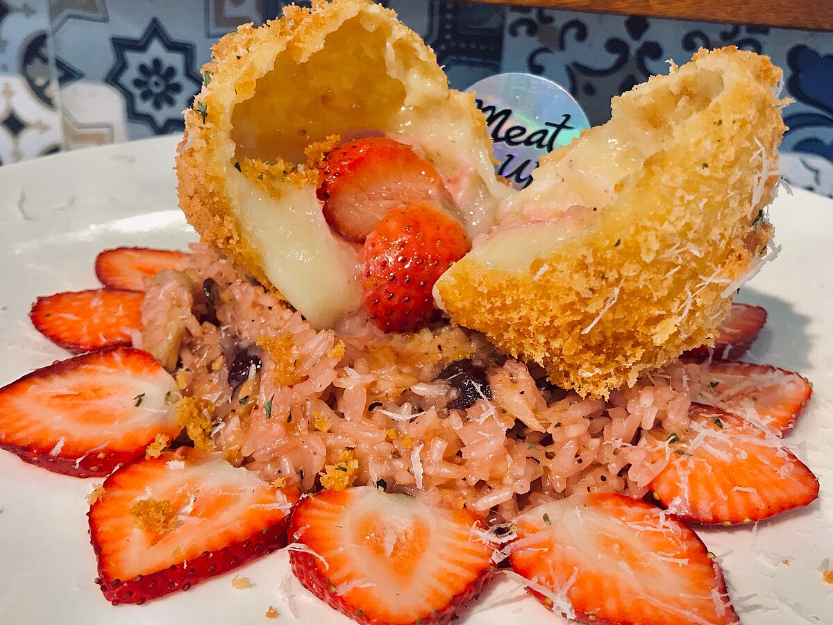 由上往下看草莓起士燉飯外觀就像一艘太空船,主廚將直徑將近5公分的馬斯瑞拉起士球下鍋油炸後放在燉飯上,一刀劃開濃郁起士傾洩而出~