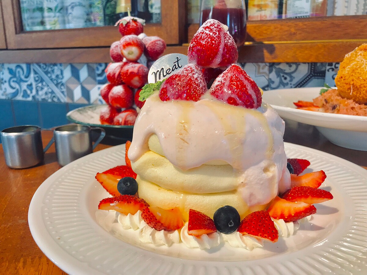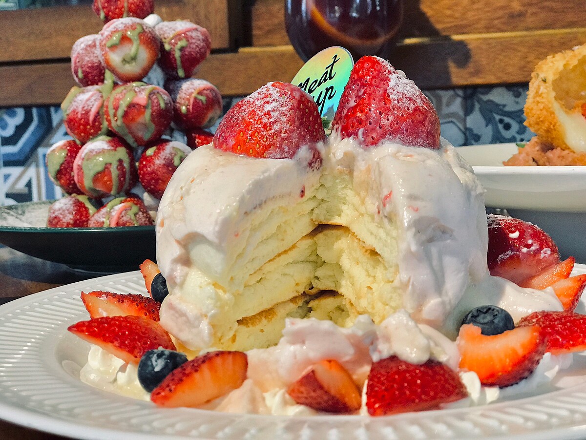現點現做以小火蒸煎,每一層舒芙蕾的厚度超過5公分,入口即化鬆軟綿密搭配自製草莓醬與優格醬,最上方放上新鮮草莓,看起來像是優雅的皇冠造型~超好拍!