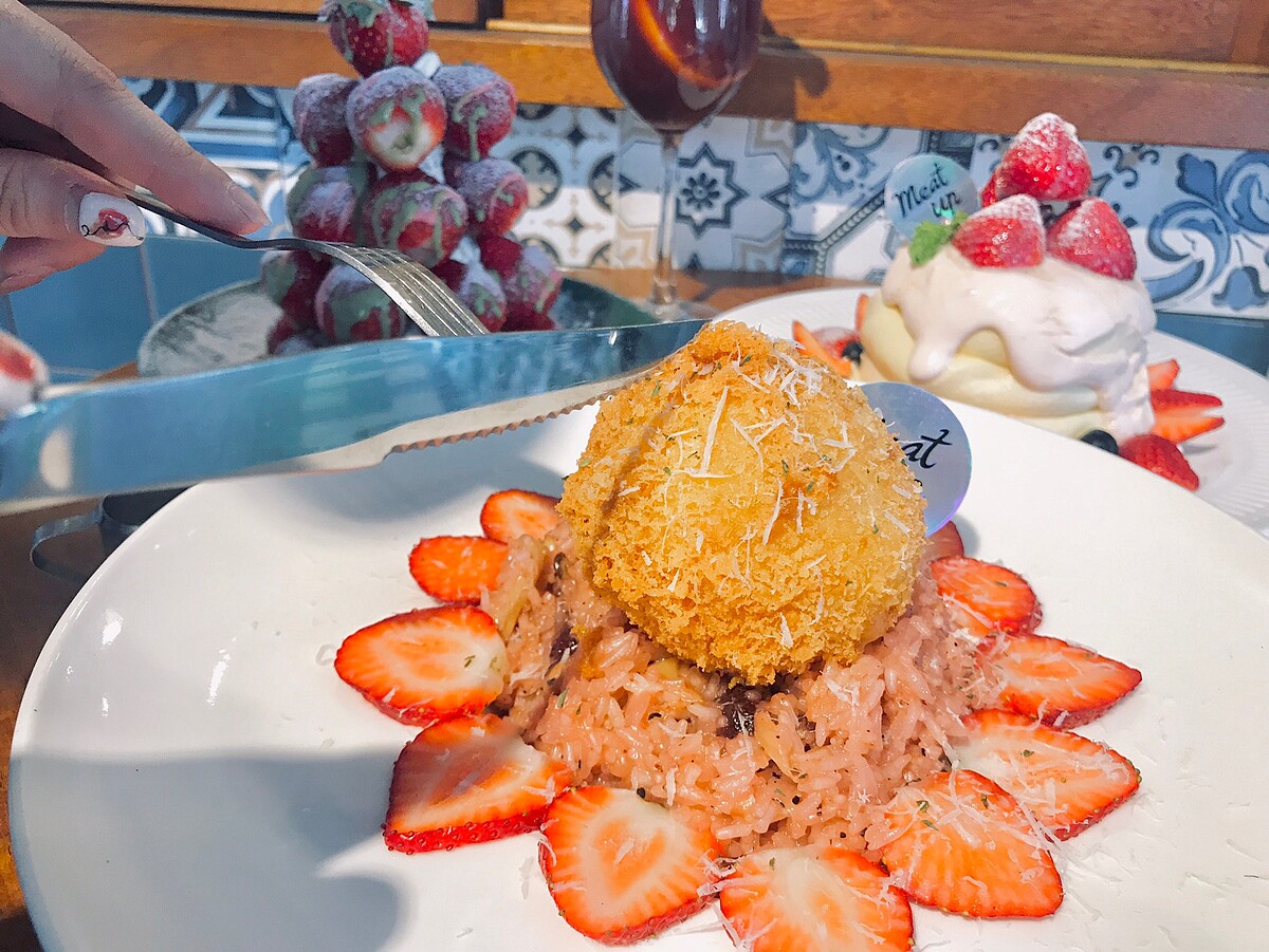 最大的亮點是切開後裡面居然還包裹一顆新鮮草莓,起士中更增添莓果香氣,燉飯部分則是以蕈菇、甜菜根烹調而成,其中還加入些許草莓乾,鹹香風味中帶點酸甜非常順口。