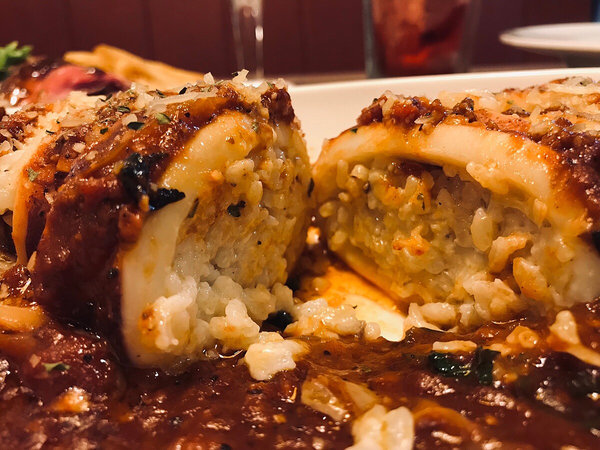 先將奶油燉飯放入整隻魷魚中,再將魷魚煎熟後放入烤箱烘烤,透過精心費時烹調手法,一口吃下香濃的奶油燉飯中帶有魷魚的鮮甜風味與口感,小編私心必點!