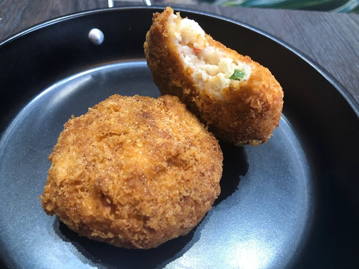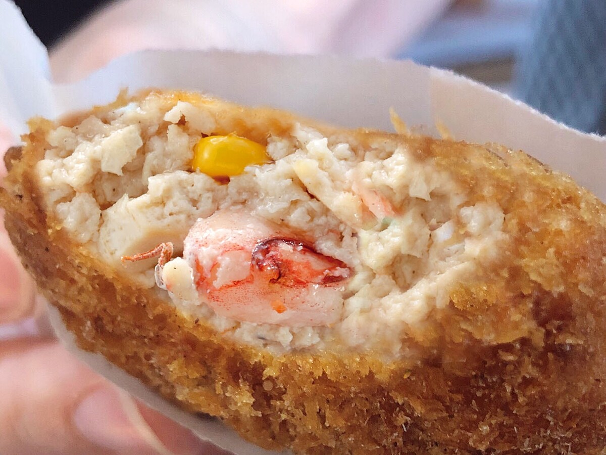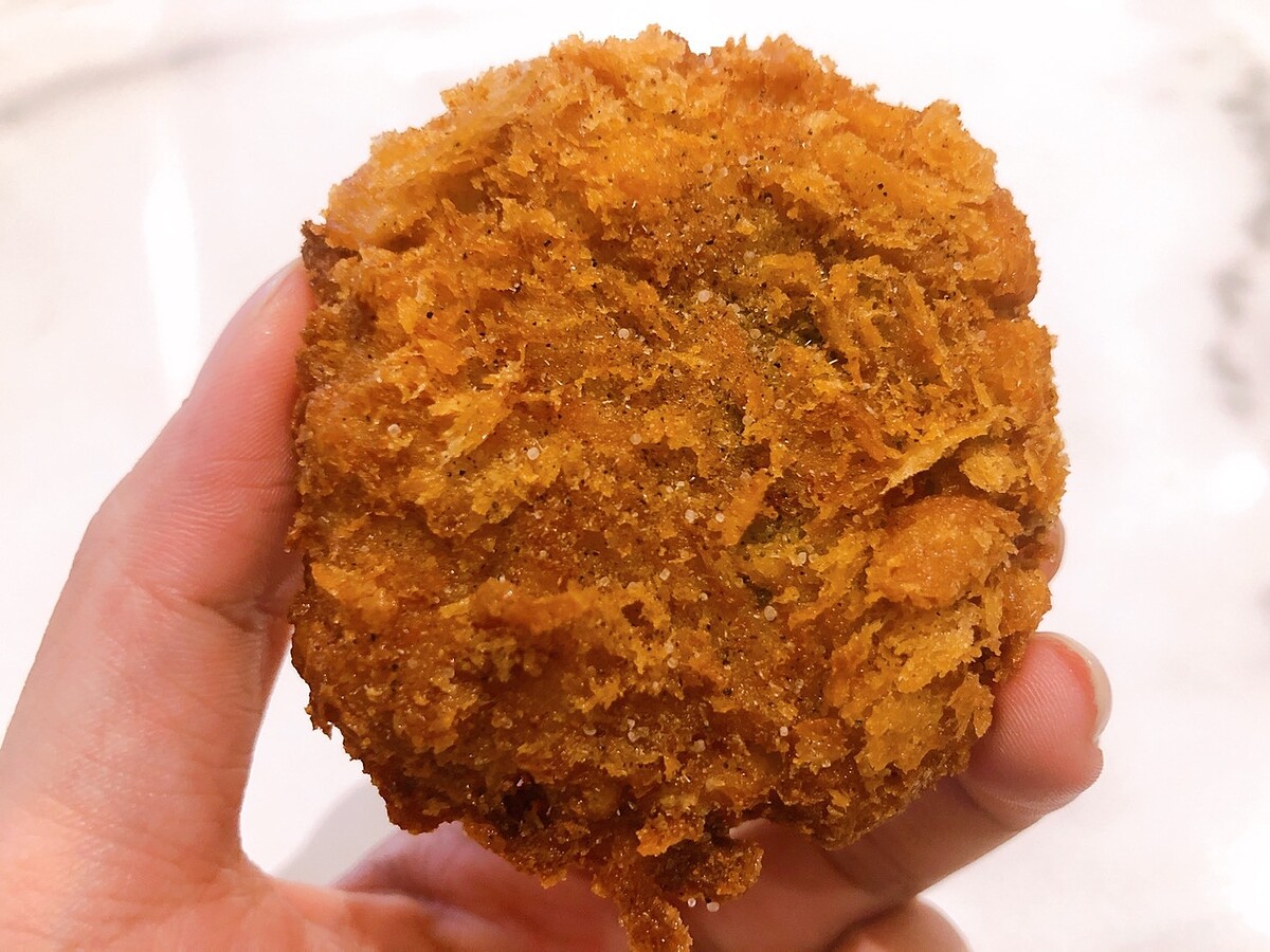手掌大的「蟹肉可樂餅」使用以魚漿、馬鈴薯、板豆腐及玉米粒,加入滿滿鮮美蟹足肉打成泥後,再包入特選完整蟹足肉,使用純手工揉捏成型,再放入鍋油炸!