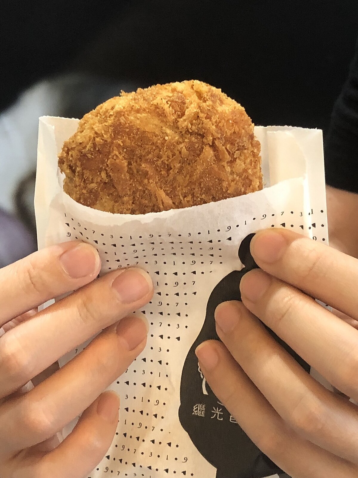 起鍋後金黃酥脆的「蟹肉可樂餅」就完成啦~入口香酥口感與蟹肉完美結合!價格也非常親民銅板50元有找就能吃到美味秋蟹~