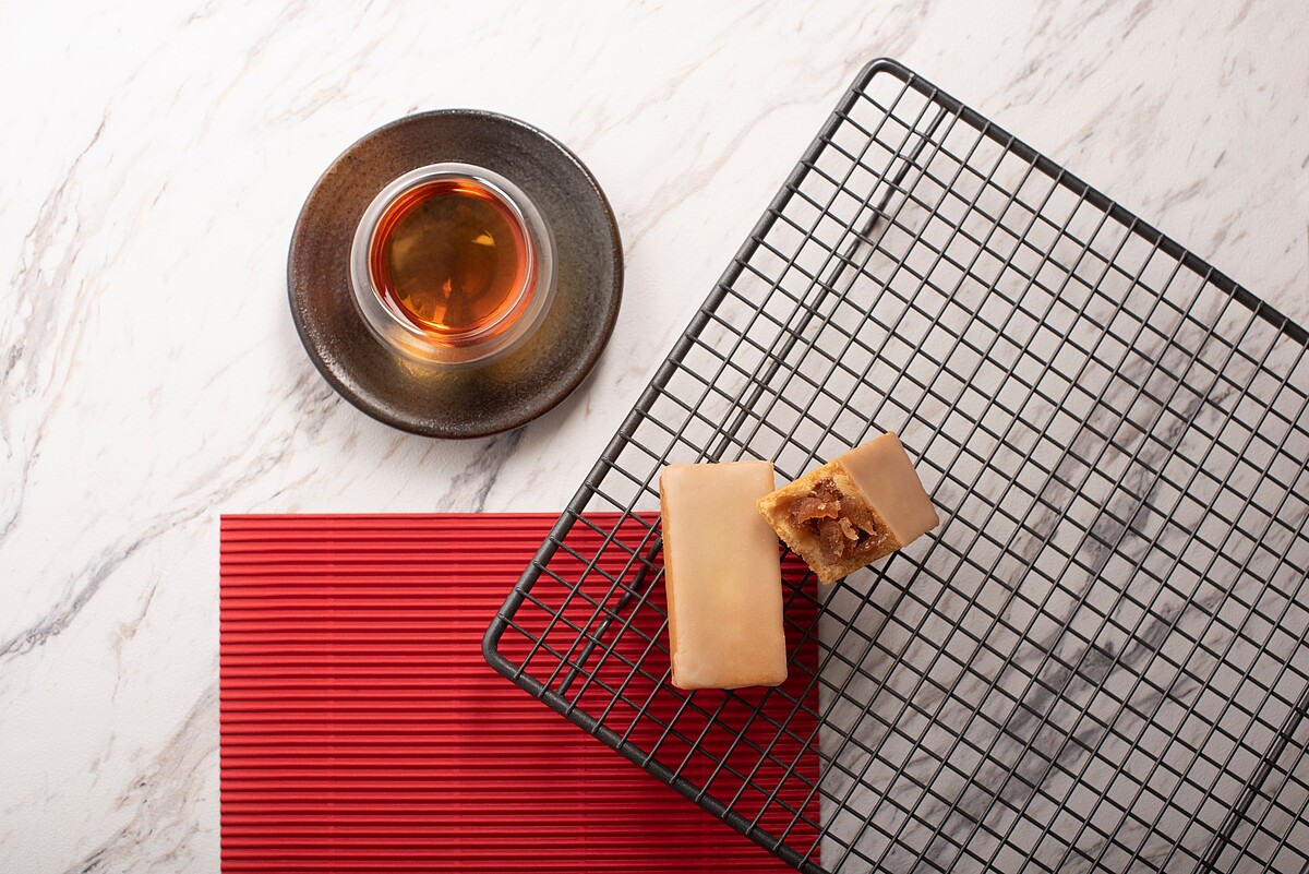 以特殊的糖漬慢煮,維持蘋果果丁的色澤與清脆口感,經過加溫烘烤的蘋果酥得以保存清新淡雅的香氣與口感。即便經過烘焙,仍保有細緻風味。