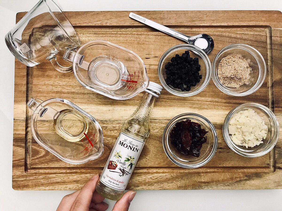 步驟五最後撒上些許蔓越莓果乾或新鮮藍莓