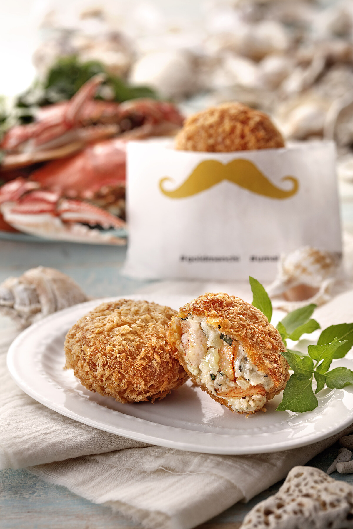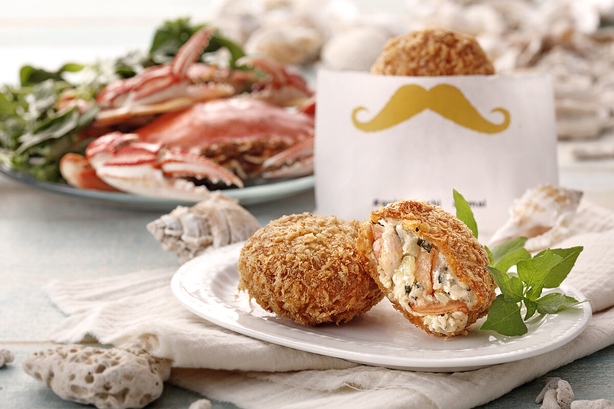 以秋季的美味「秋蟹」為主題,推出蟹肉名氣餅,以日本常見的「蟹肉奶油可樂餅」為發想,將整塊蟹管肉與蝦漿混搭製作內餡,一般市售的蟹肉餅內餡是蟹肉細絲。