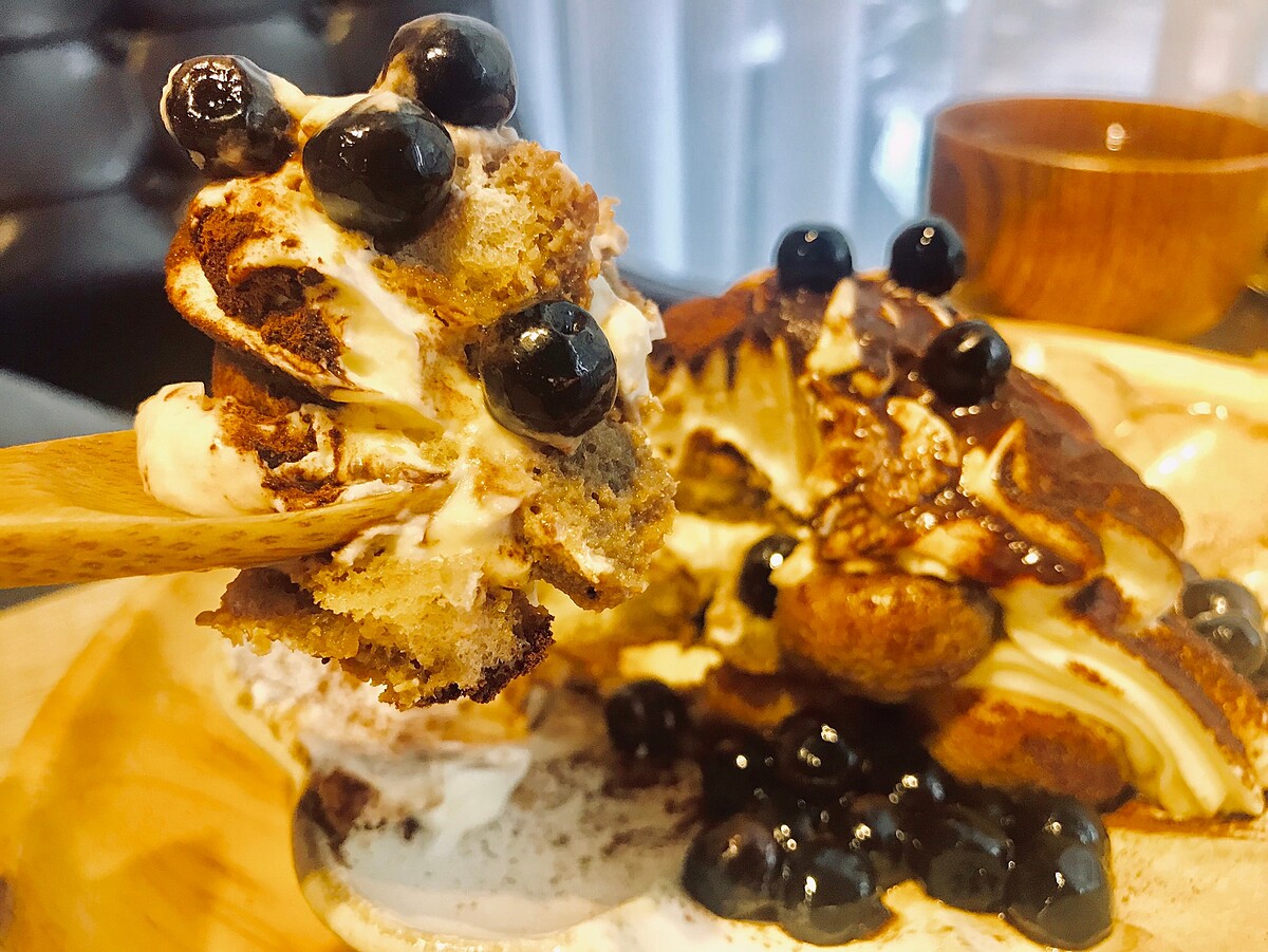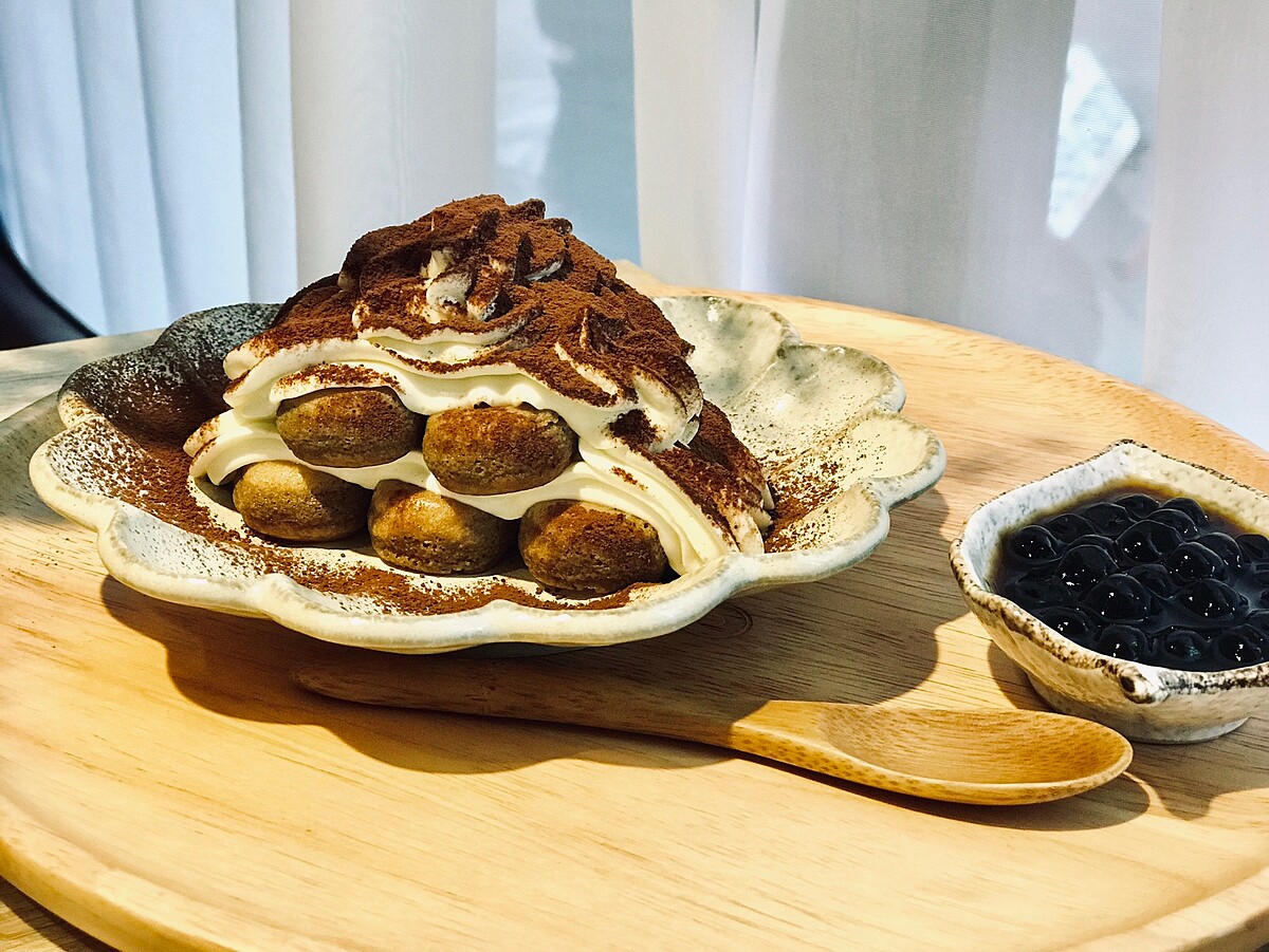 這款提拉米蘇呈現方式十分特別,不像市售的提拉米蘇使用盒裝或杯裝,而是將浸泡在貝禮詩奶酒中的手指餅乾直接盛盤呈現!