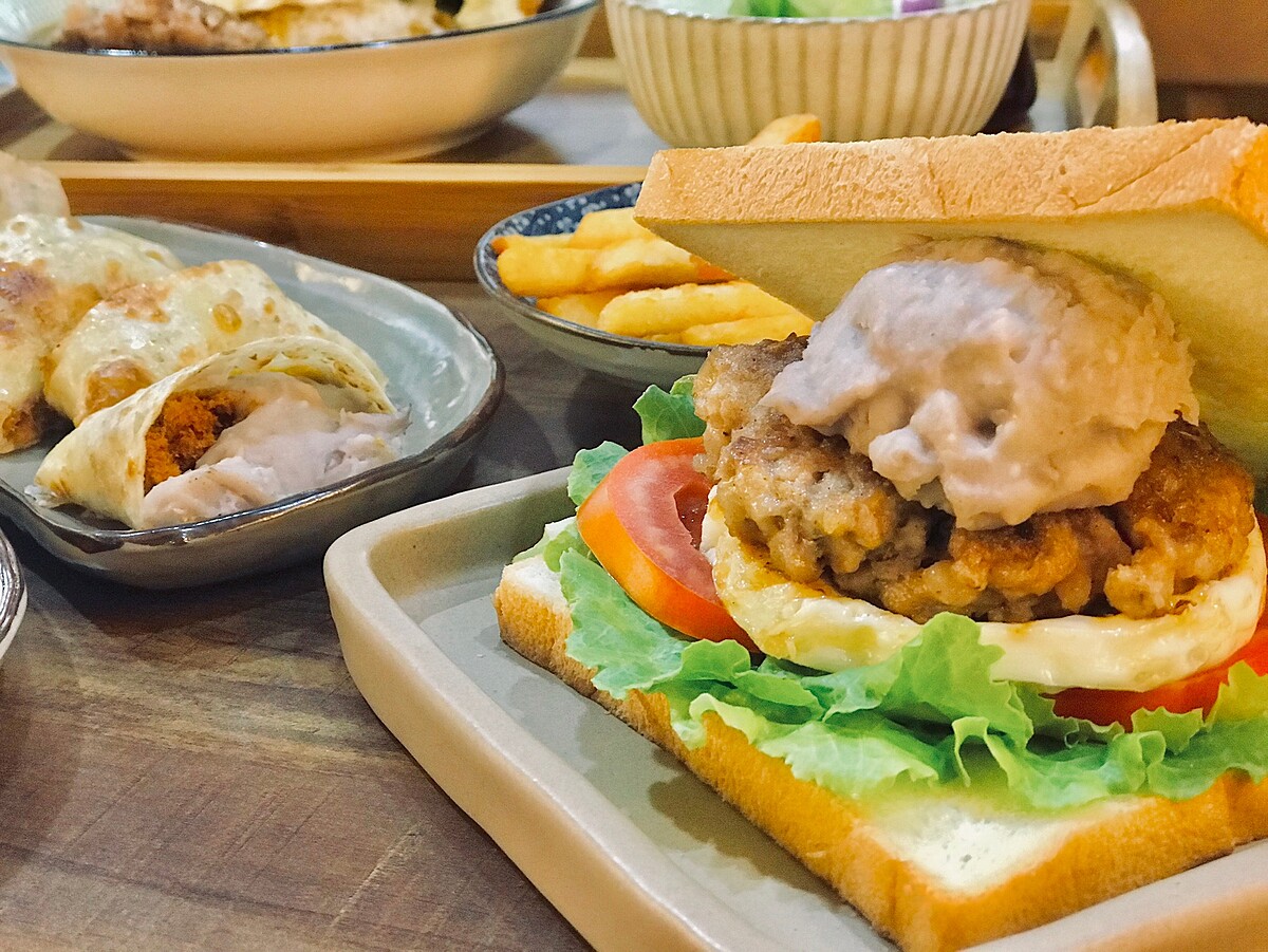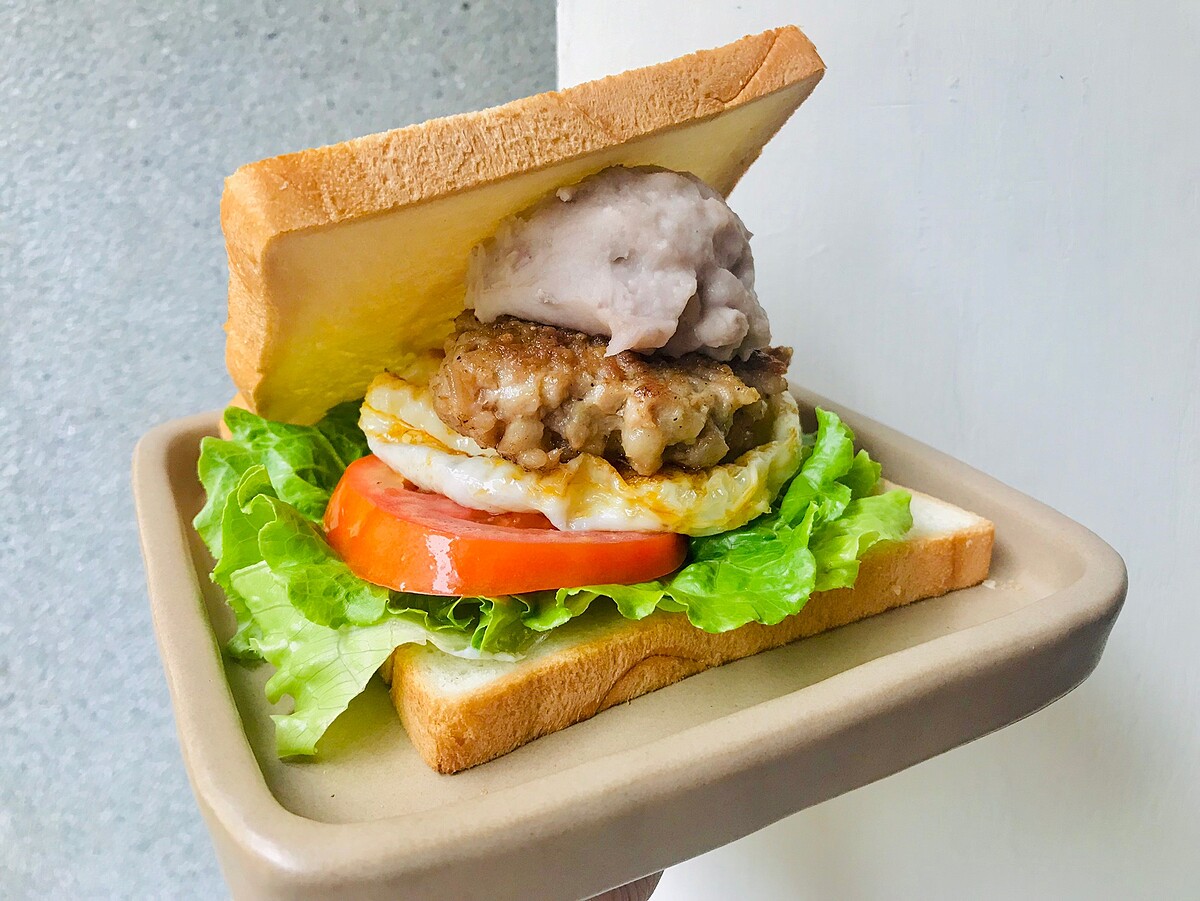 店內手工自製香濃芋頭餡料,再將芋泥抹在土司上,搭配店內招牌自製的手打豬肉排、蕃茄片及新鮮時蔬,芋泥與手打豬肉的風味完美結合!