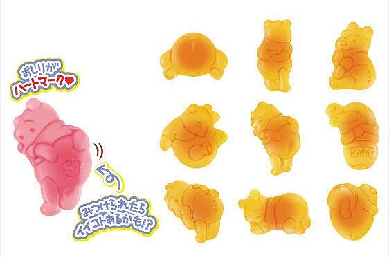 「小熊維尼軟糖」分別有9款不同造型的黃色維尼軟糖,像是睡著維尼、貪吃跌進蜂蜜罐的維尼……等等。每一款維尼軟糖紋路都做得好精緻!