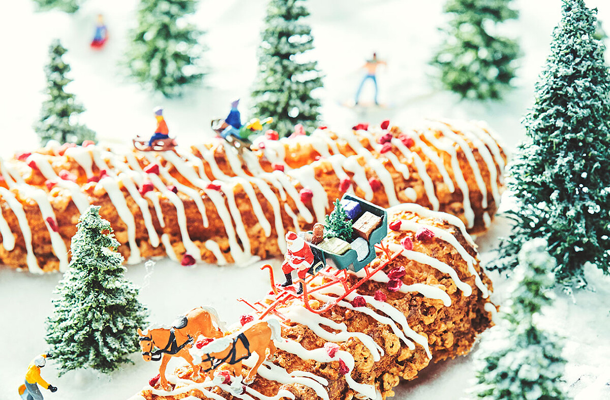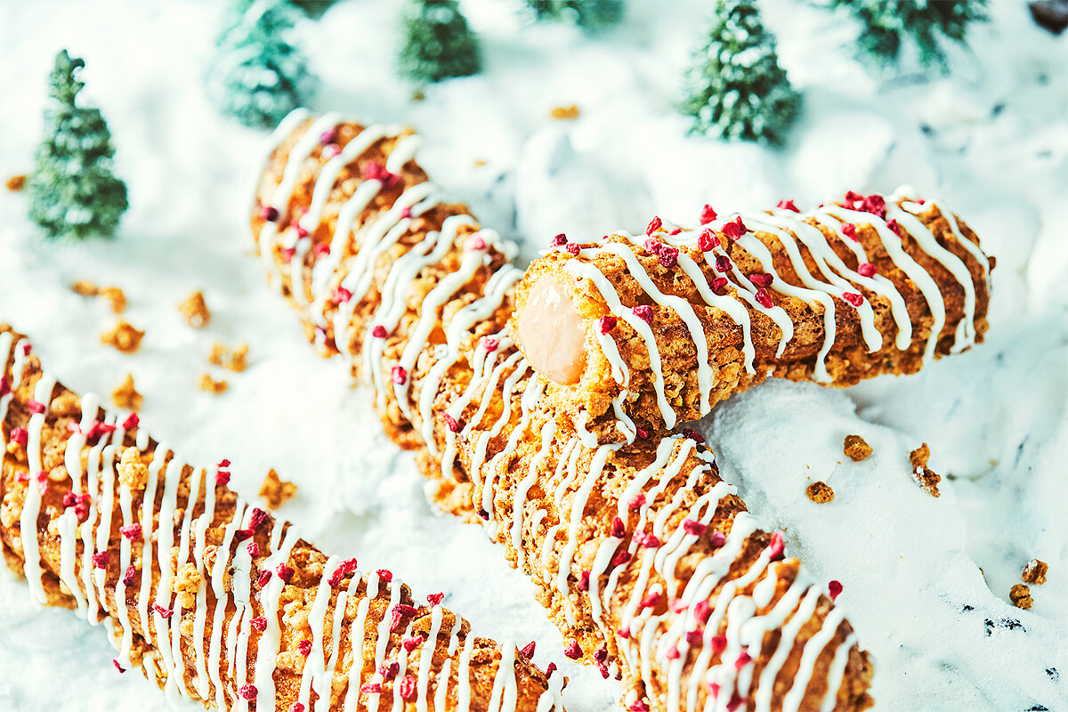 灑滿杏仁粒的鬆脆泡芙,注入質地細膩的草莓風味卡仕達醬,均勻撒上如雪般純白的巧克力,再點綴精選蔓越莓碎粒可愛的外觀及恰到好處的甜度,最適合聖誕禮物及聚會一同享用。