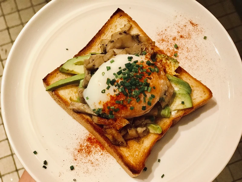 香料煎菇再搭配哈斯酪梨,最上方放上半熟蛋,看著蛋液緩緩流下超誘人~