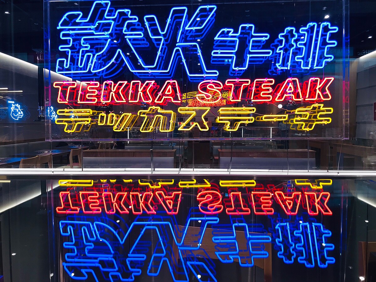 入口霓虹燈管logo及店內裝飾的牛型插畫充滿動漫電玩風格。