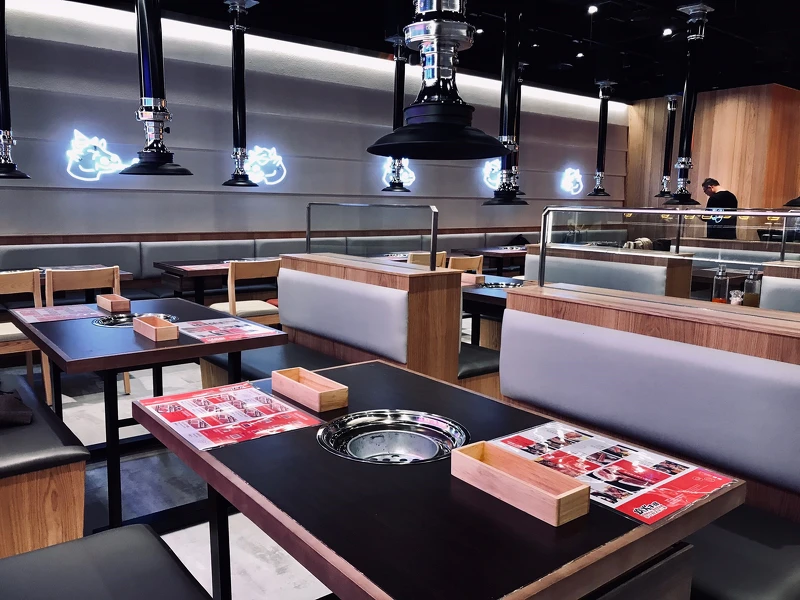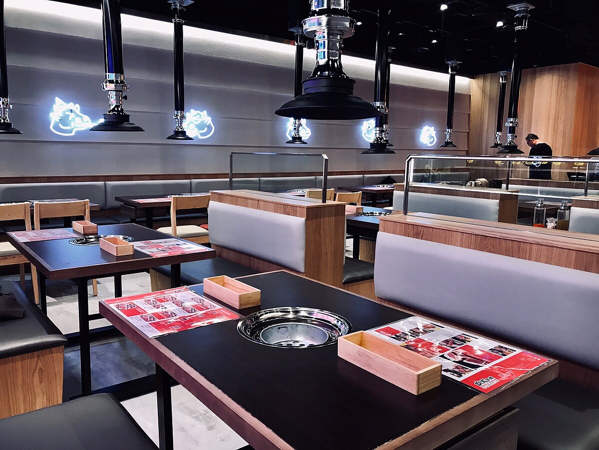 《鉄火牛排&燒肉》餐廳整體空間明亮寬敞,以白色牆面與淺木色傢俱相互搭配~