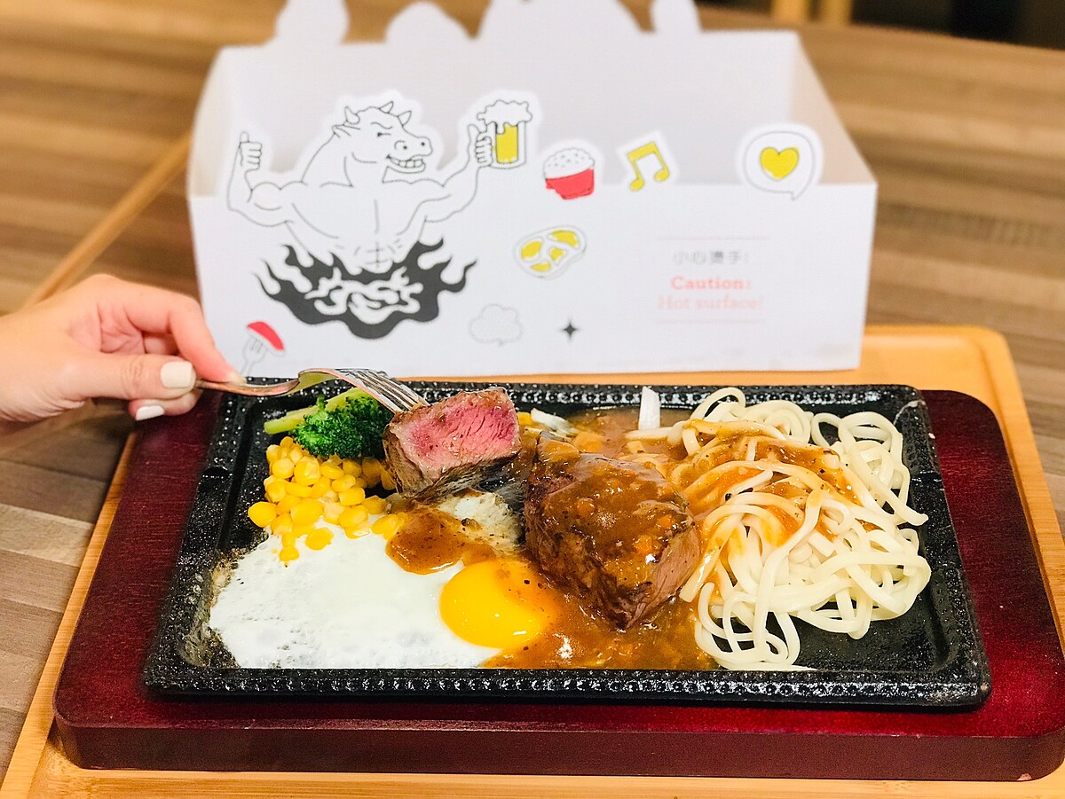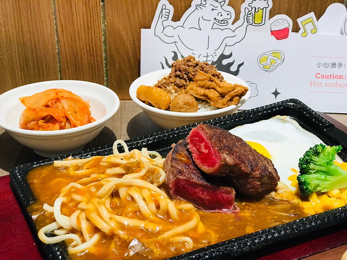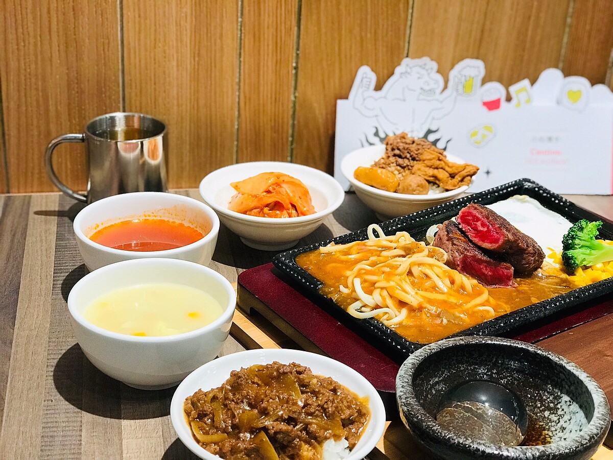 搭佐太陽蛋、彈牙麵條、各色時蔬以復古鐵板裝盛,噴香上桌~滋滋聲響伴隨陣陣撲鼻肉香,令人垂延三尺。豐富附餐包含湯品、和牛滷肉飯、甜品及飲料,皆可無限享用。