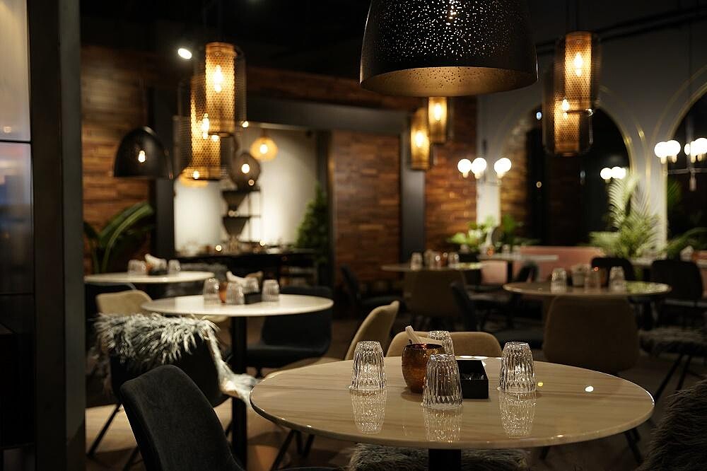 從桌椅、杯盤、燈具,都是瑪黑家居選物的美感延伸,為優雅沉穩的用餐環境增添質感品味。駐店主廚葉鎮宇以法系餐酒小菜為主軸,一道道的歐陸料理,加入台灣食材,如蔥油餅X墨西哥Taco的油封鴨腿塔可、鹹蛋黃金沙X歐式麵疙瘩而成的「地瓜麵疙瘩」,都是意想不到的口感。