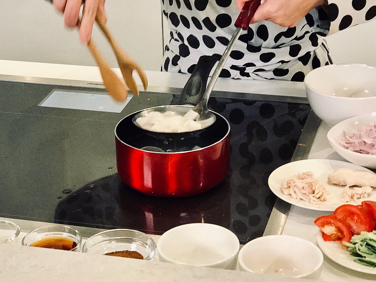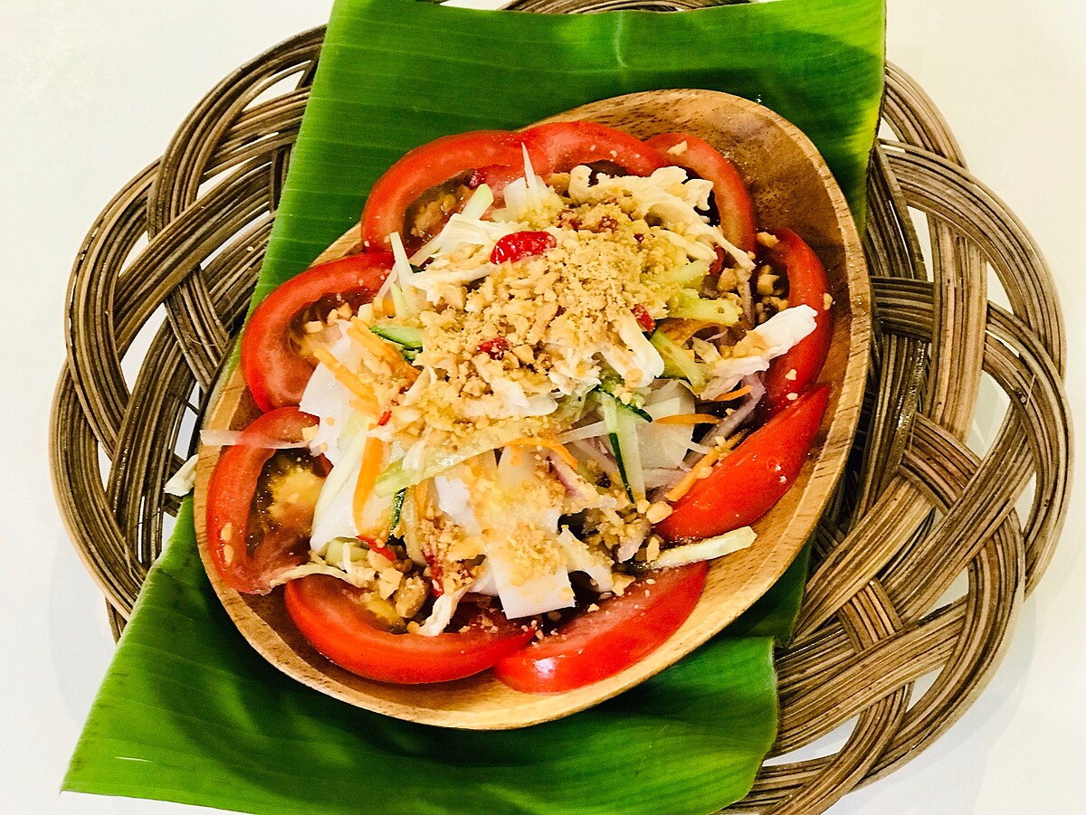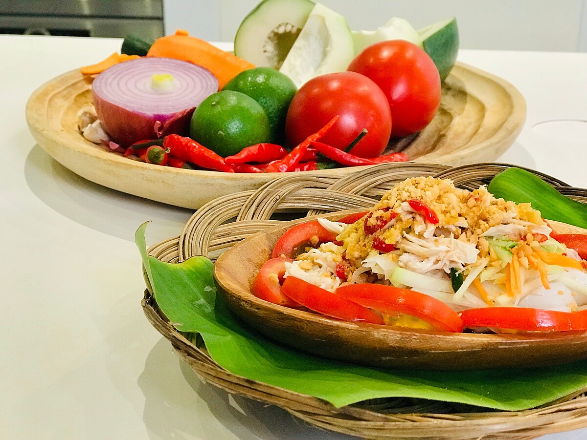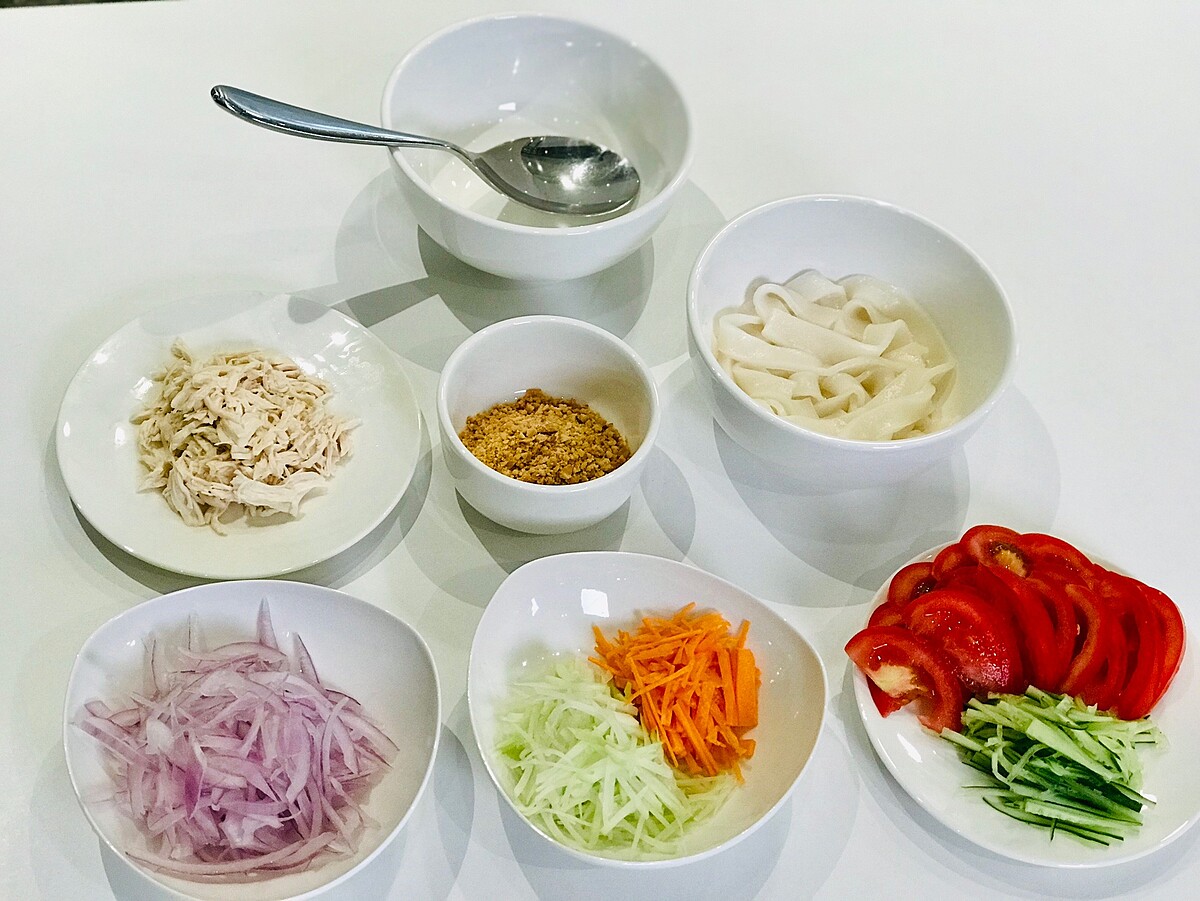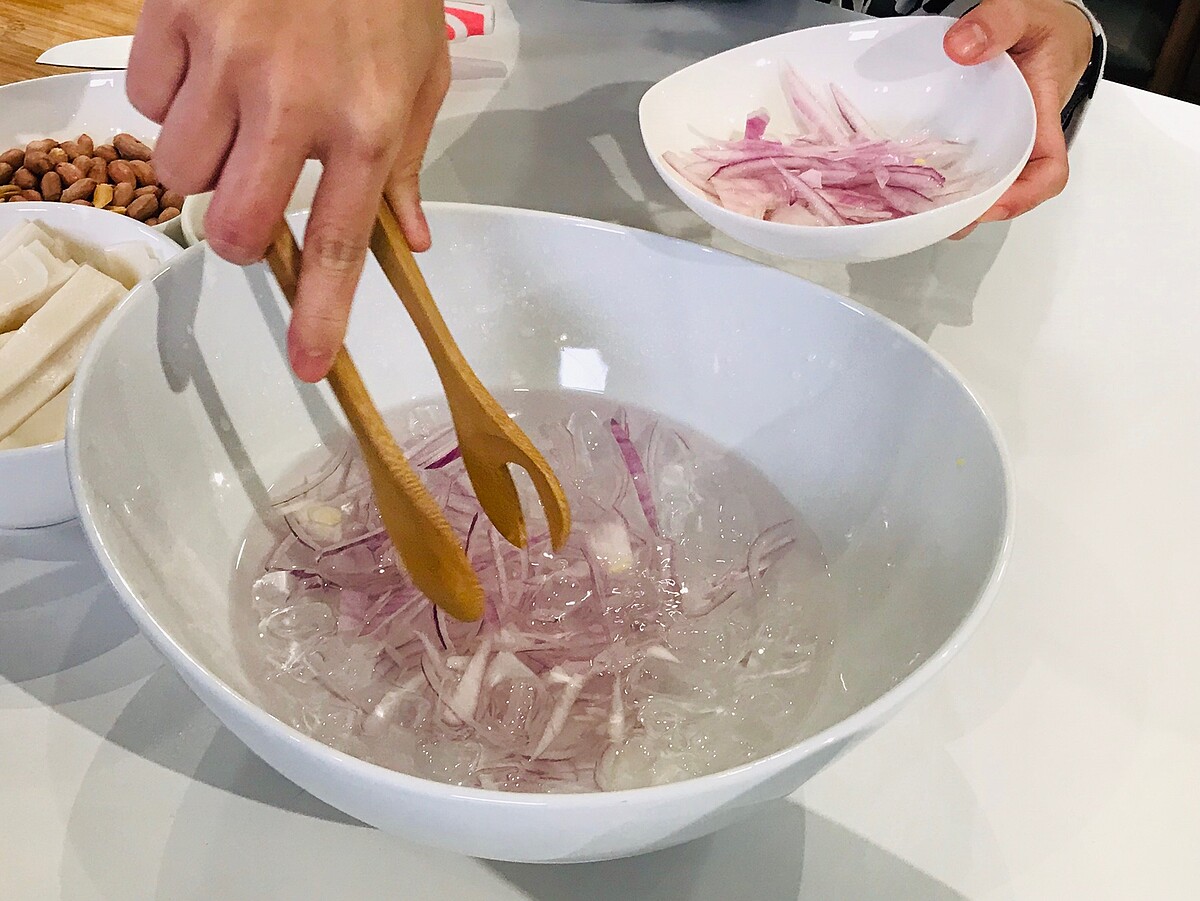 切好的洋蔥、小黃瓜絲、青木瓜絲、紅蘿蔔絲可泡冰水,讓口感更脆冰涼,洋蔥泡過冰水後可減少嗆辣感,更脆更甜。雞肉使用手撕的方式更能保持口感!