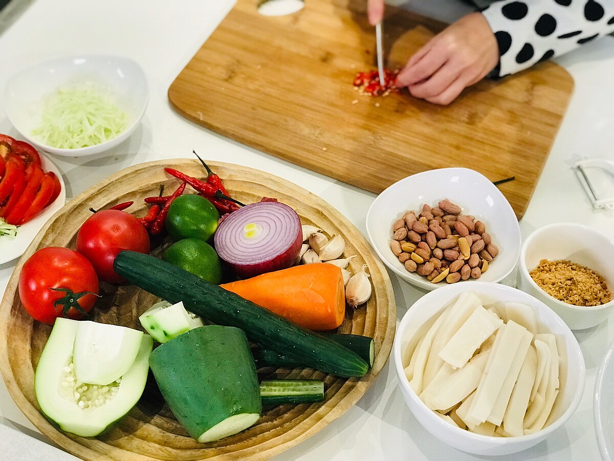 步驟二、除花生,其他食材洗淨,青木瓜、小黃瓜、紅蘿蔔刨絲或切細,洋蔥切絲,番茄切瓣,辣椒、蒜頭切細末,花生磨碎備用
