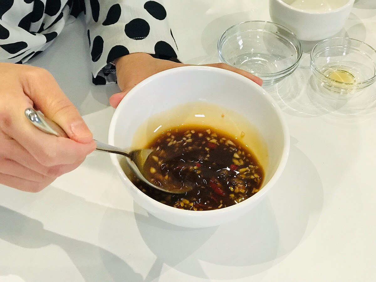 朝天椒 0.5-1根、蒜頭 半顆、魚露1大匙、檸檬汁2茶匙、二砂3茶匙、開水 1.5大匙。