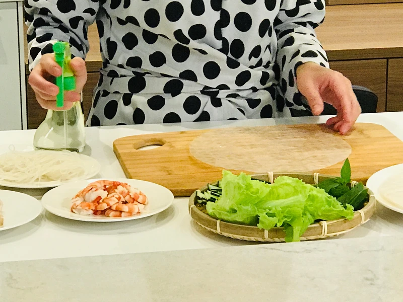 步驟三、越南春捲皮放在桌上或熟食沾板上,正反兩面噴水沾濕。