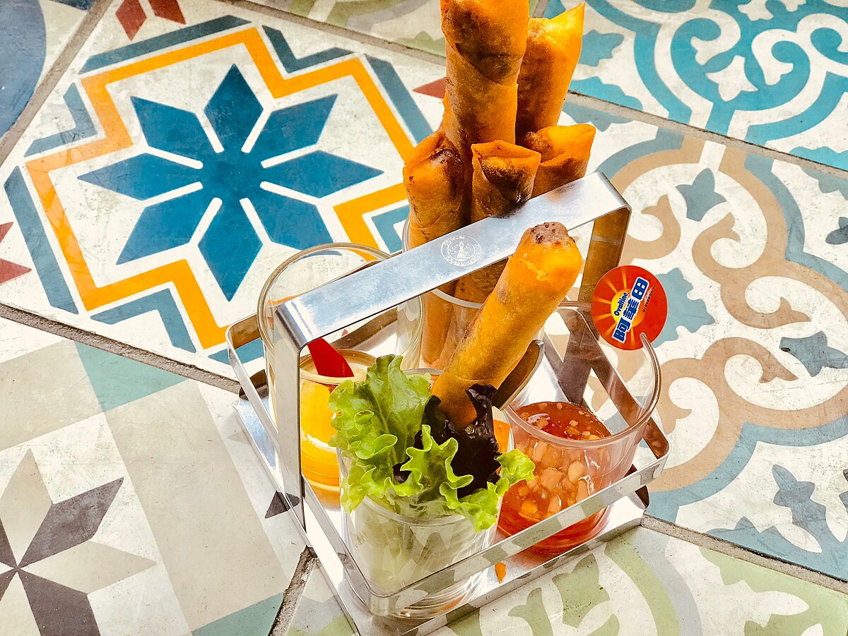 春捲內餡料是有草蝦仁、豬絞肉+木耳..等,用春捲皮將脆酷力抹醬抹入後,下鍋高溫油炸,保留脆酷力抹醬的顆粒口感,鹹甜涮嘴。沾醬則有甜雞醬及酸辣醬可選擇。