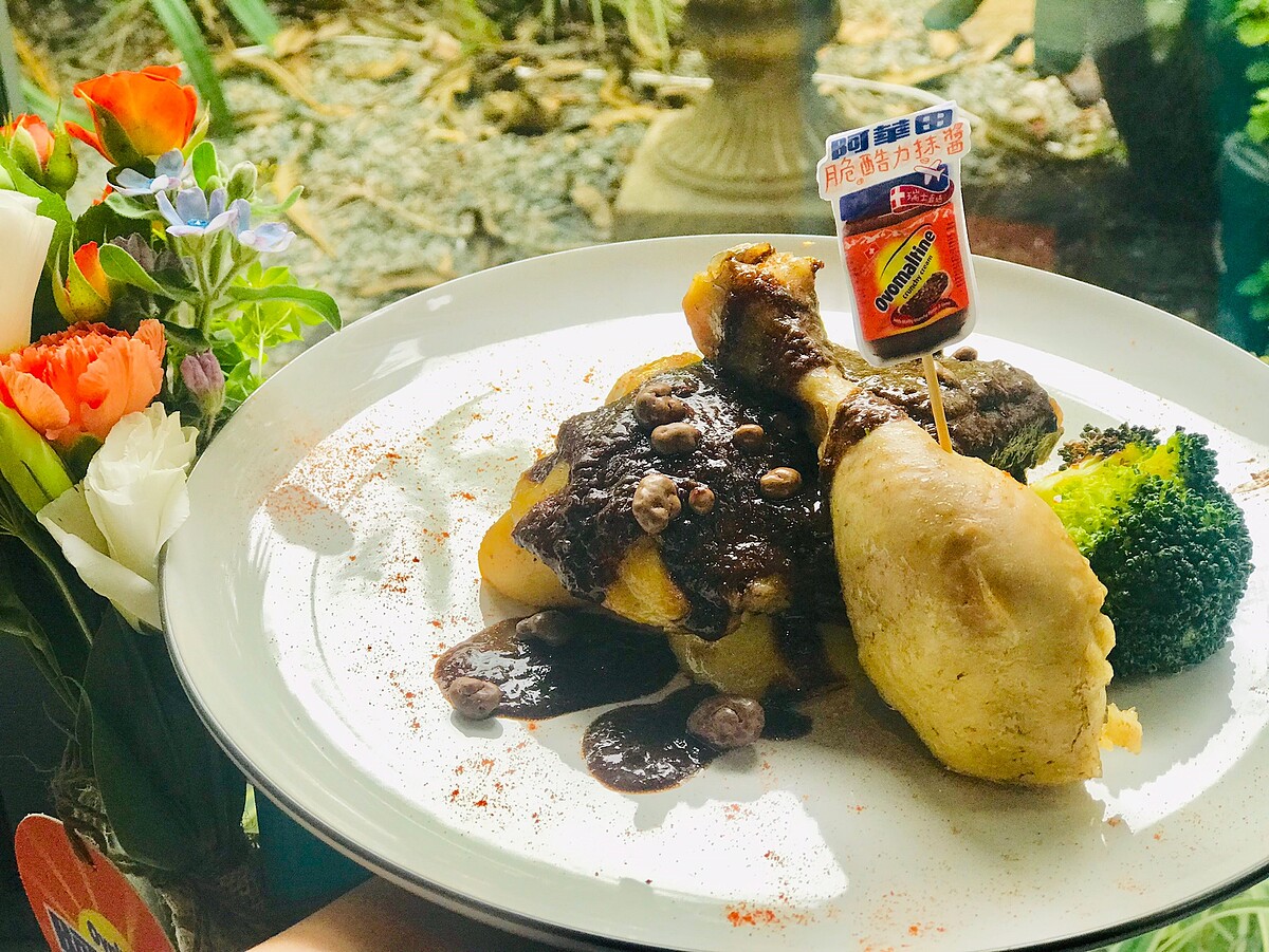 選用上等雞腿肉,用低溫熟成,淋上香料、醬油...等調味熬煮成辣阿華田醬汁,搭配花椰菜及馬鈴薯,顛覆傳統味蕾。