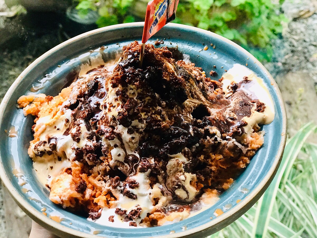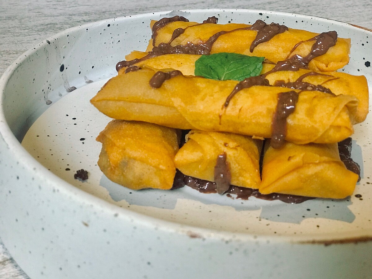 泰國傳統路邊小食甜點 :香蕉煎餅,使用台灣產香蕉包好後,淋上阿華田醬。