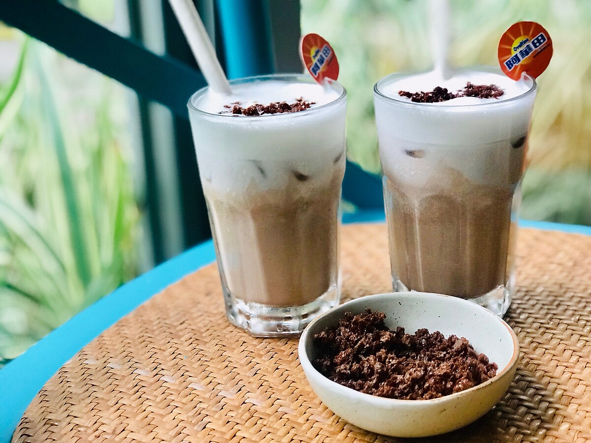 阿華田沖泡後加上椰奶及新鮮牛奶泡,最後撒上滿滿的阿華田,每杯附上一份脆酷力,增加品嚐時的酥脆感,提升整體風味。