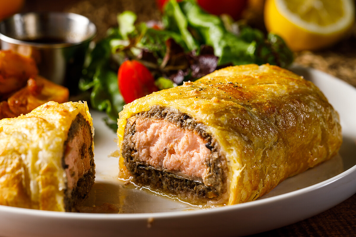厚切鮭魚排先以舒肥做法增加其鮮嫩度,外層以英式辣味芥末醬、蘑菇泥與堅果泥浸潤後,再以酥皮包裹香烤而成