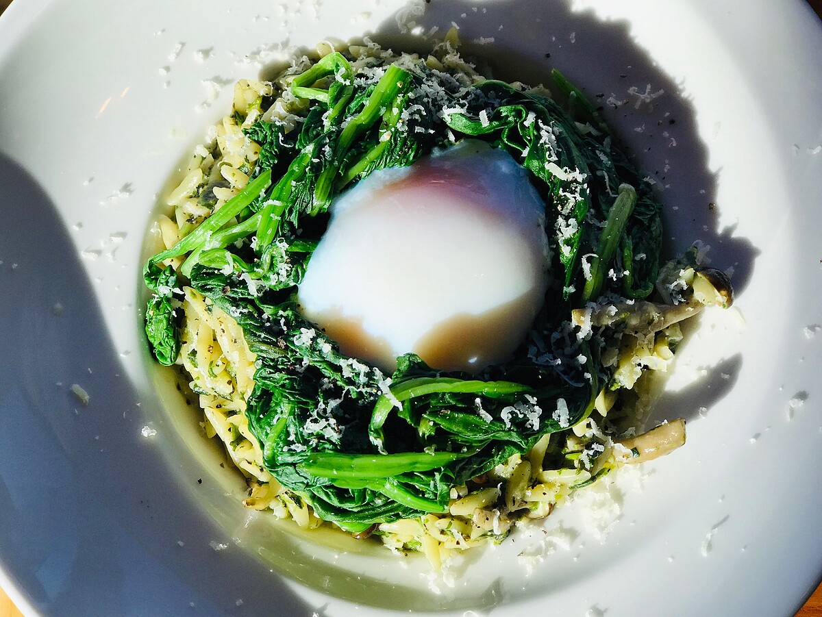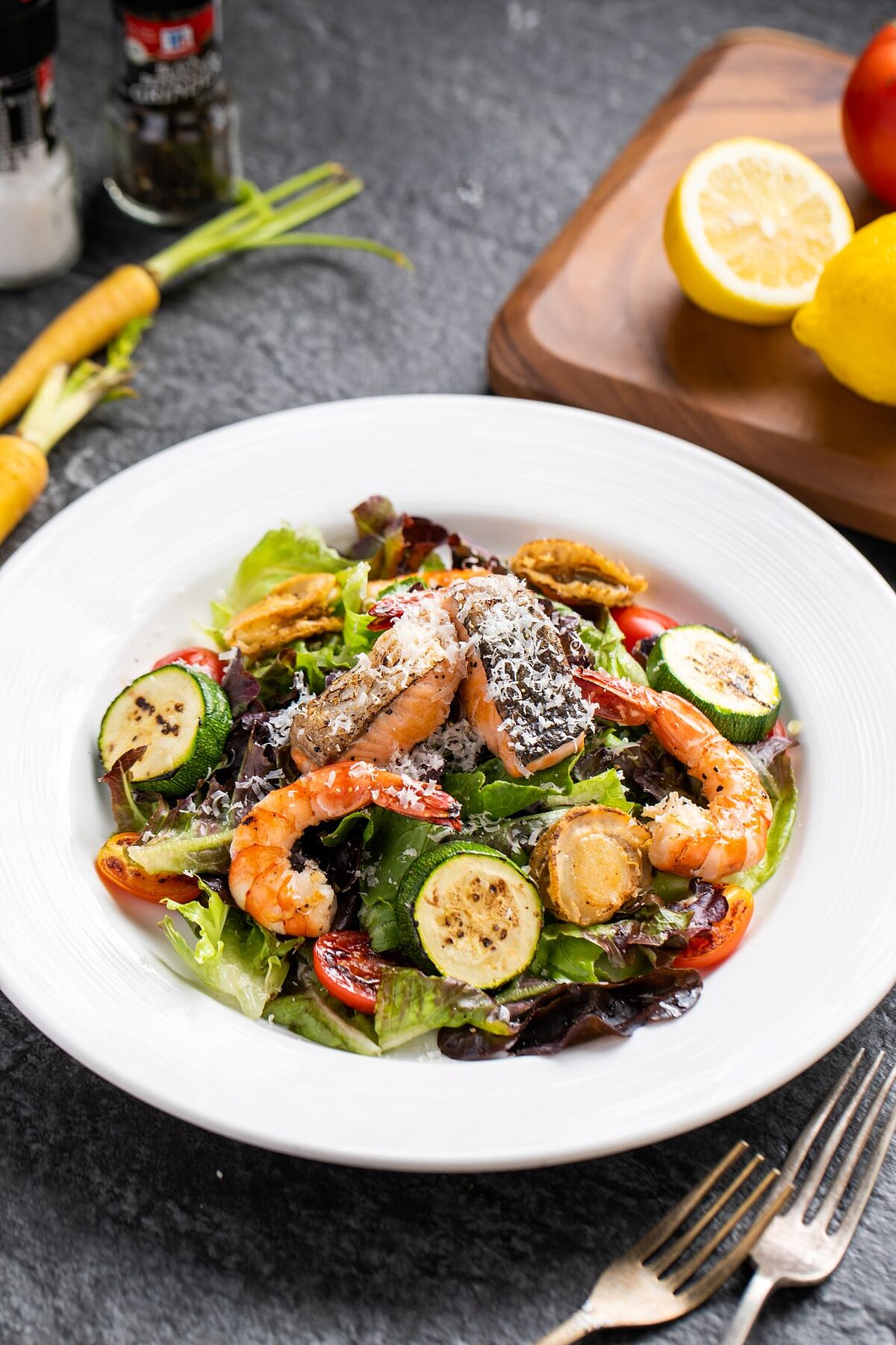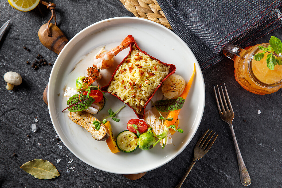 特殊造型米型麵搭配香烤草蝦、干貝和透抽,搭配刷上紐奧良Cajun醬香烤的紅黃色櫛瓜、雞蛋洋芋、小紅蘿蔔以及抱子甘藍。