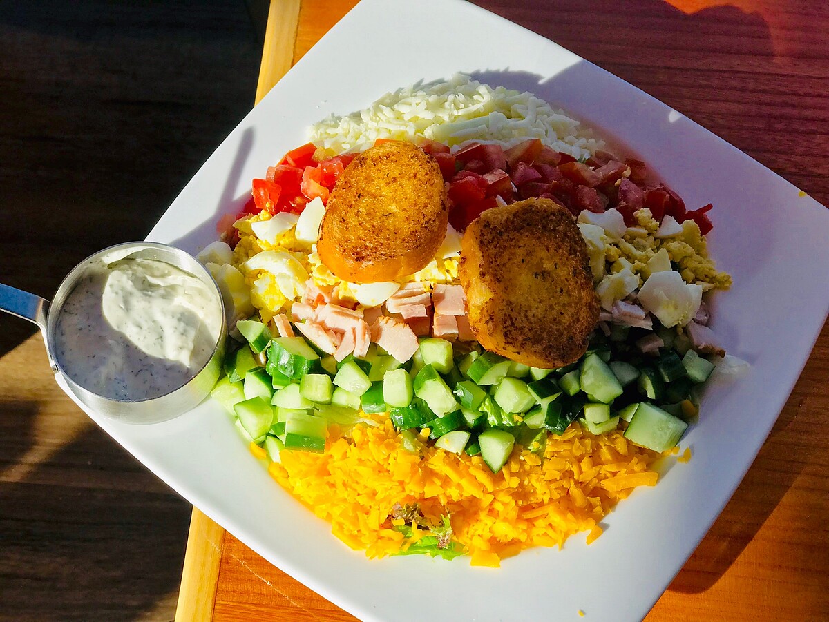 色彩繽紛有如彩虹一般,加入火腿丁、兩種起司、蕃茄丁、黃瓜丁、水煮蛋……等等,大口吃肉之餘搭配沙拉享用也非常爽口!