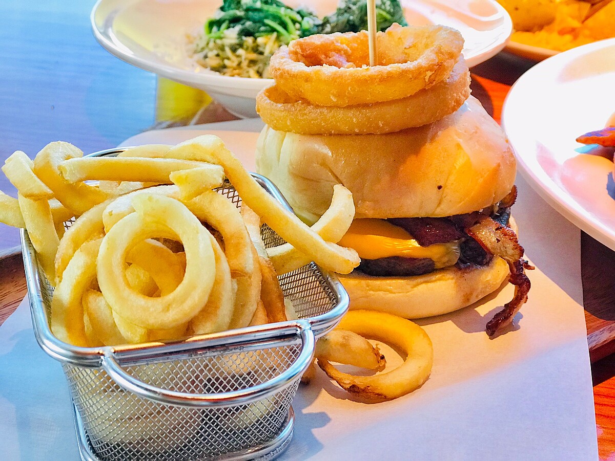 8oz牛肉漢堡搭配BBQ醬、切達起司、培根、洋蔥!