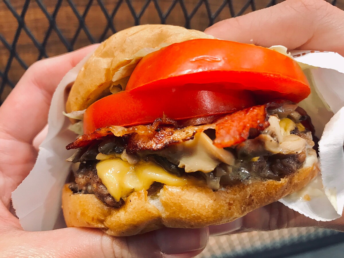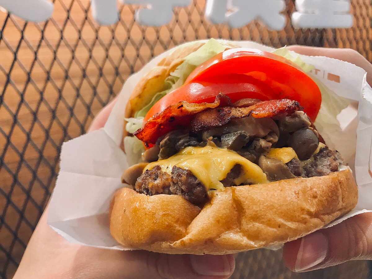 夾入起司與牛肉後在鋪上滿滿的高級蕈菇、培根、蕃茄……豐富食材,真材實料超厚實的漢堡,每一口都超滿足!