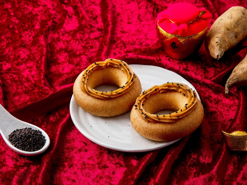 鬆軟法蘭奇伴隨著雞蛋香氣,沖繩黑糖MIX台灣番薯迸出完美內餡,點綴烘烤黑芝麻。層層驚喜的濃郁滋味,為新的一年補充滿滿的金黃能量。