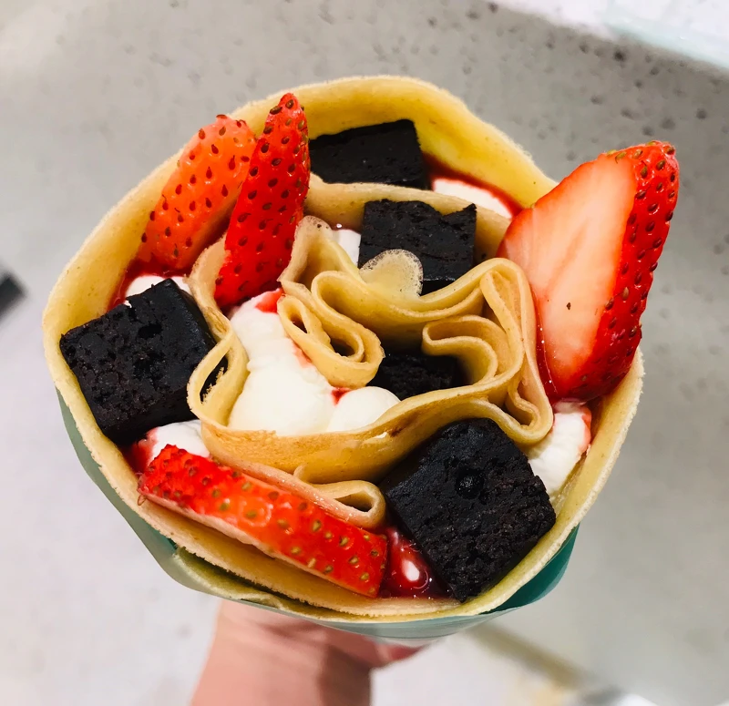 草莓季絕對要來點酸甜的新鮮草莓,擠上法國總統牌鮮奶油、淋上巧克力醬、莓果醬、OREO餅乾粉,最後再搭配店內自製的布朗尼,偏向苦甜味的巧克力,不會過於甜膩是屬於大人味的可麗餅!