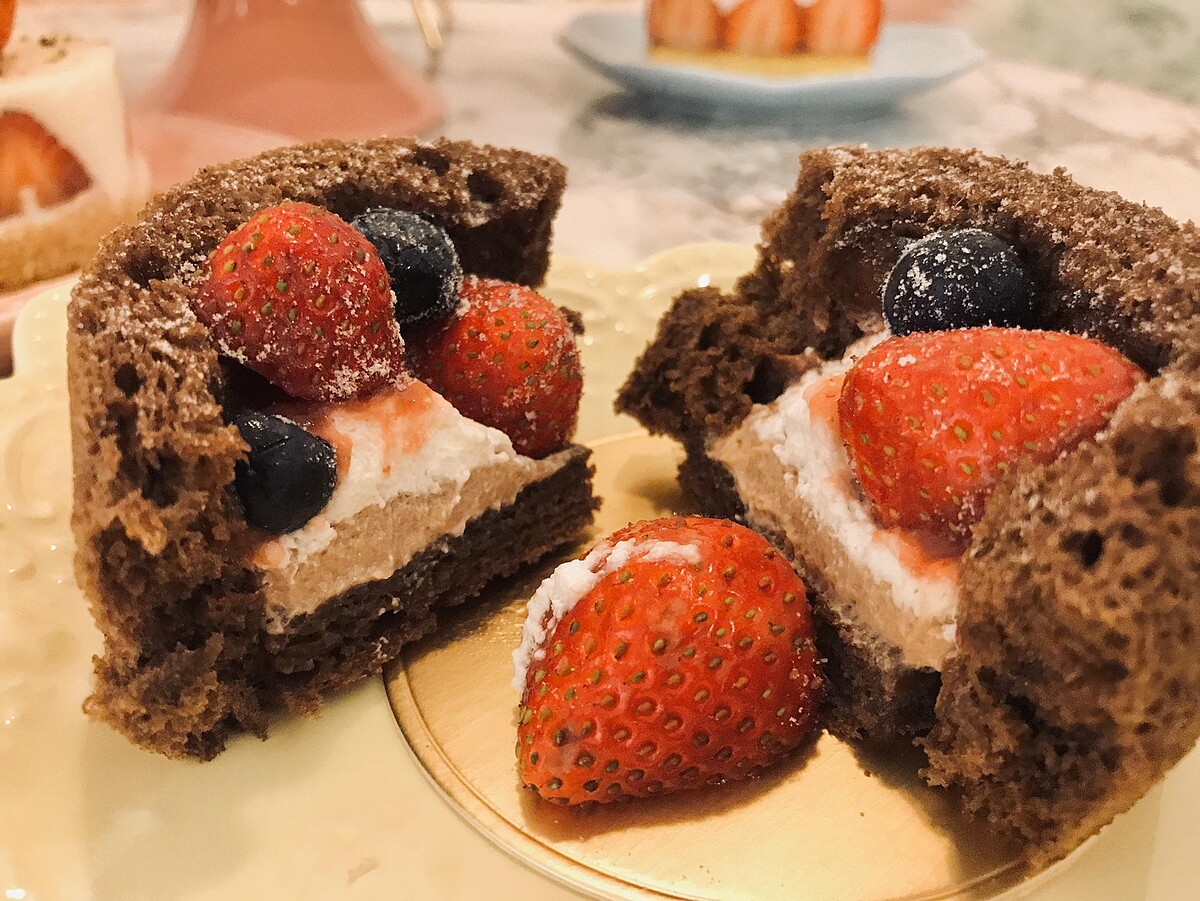 巧克力海綿蛋糕,再搭配巧克力慕斯、草莓奶酒鮮奶油,還有新鮮草莓,帶有淡淡奶酒香氣與巧克力的香濃,巧克力控不能錯過!