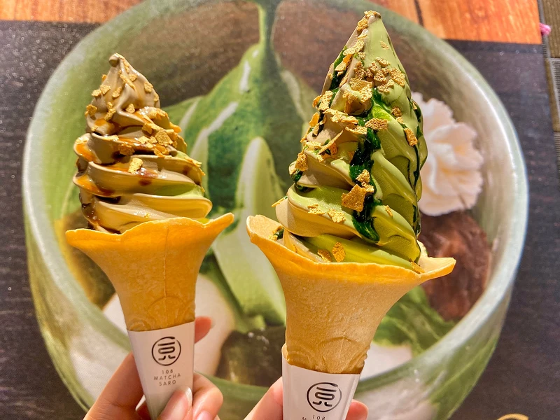 黃金抹茶/焙茶霜淇淋不論是哪一種口味,撒上法國金色脆片,顏色搭配看起來更加奢華,除了像金箔般的華麗外,法國金色脆片更增添香脆的口感,最後再淋上抹茶蜜或黑糖蜜,多層次風味讓人一吃就愛上!