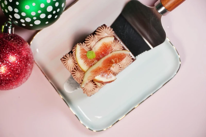 冬季除了適合吃草莓以外,還有香濃的巧克力也絕不能錯過!微甜室將冬季暖心飲品阿華田打成奶油,選用55%法芙娜苦甜巧克力製成紮實巧克力蛋糕,在蛋糕夾層間抹上巧克力甘納許、堅果碎片增加濕潤度及層次。