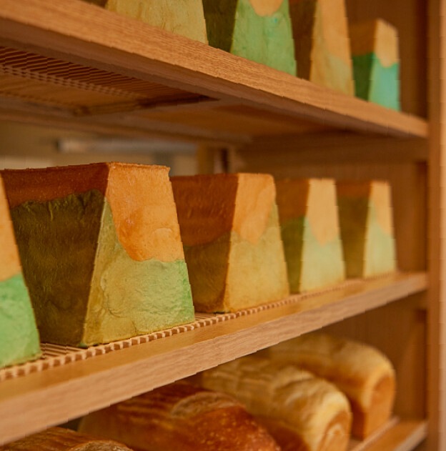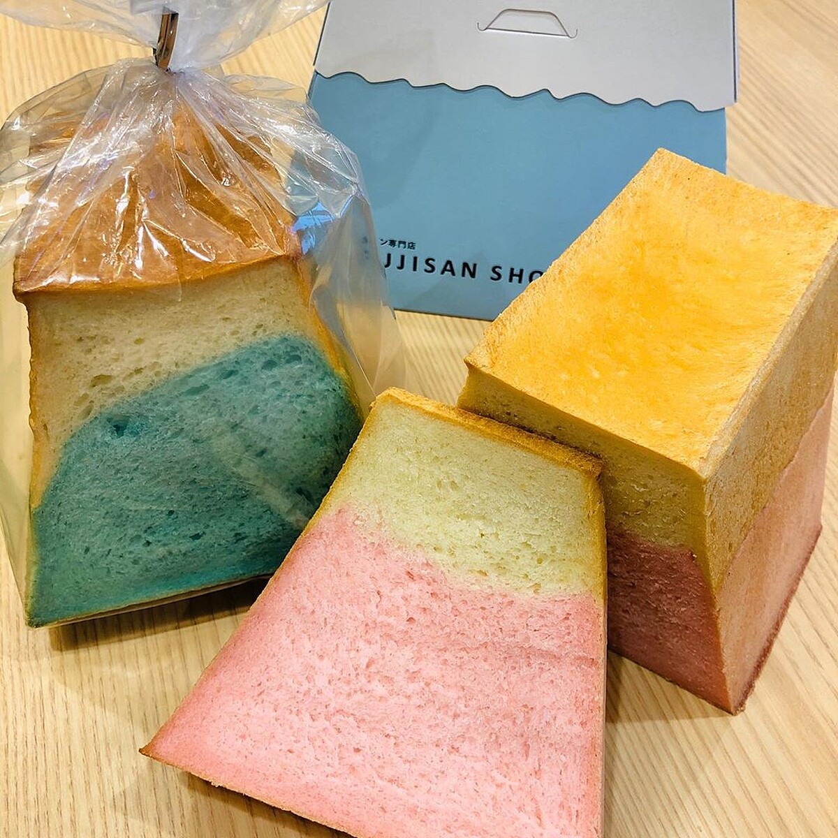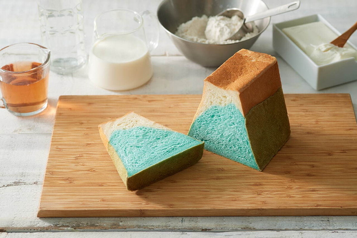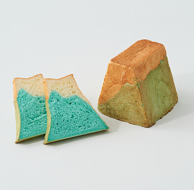 尚未切開的吐司外觀看起來樸實無華,但切開後裡面居然藏著一座富士山的再搭配藍色、白色呈現出山頂被雪覆蓋的經典景緻!