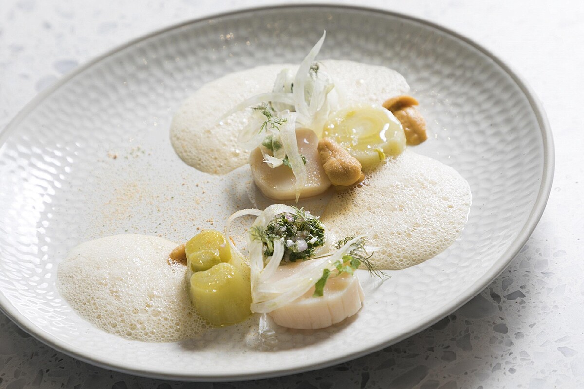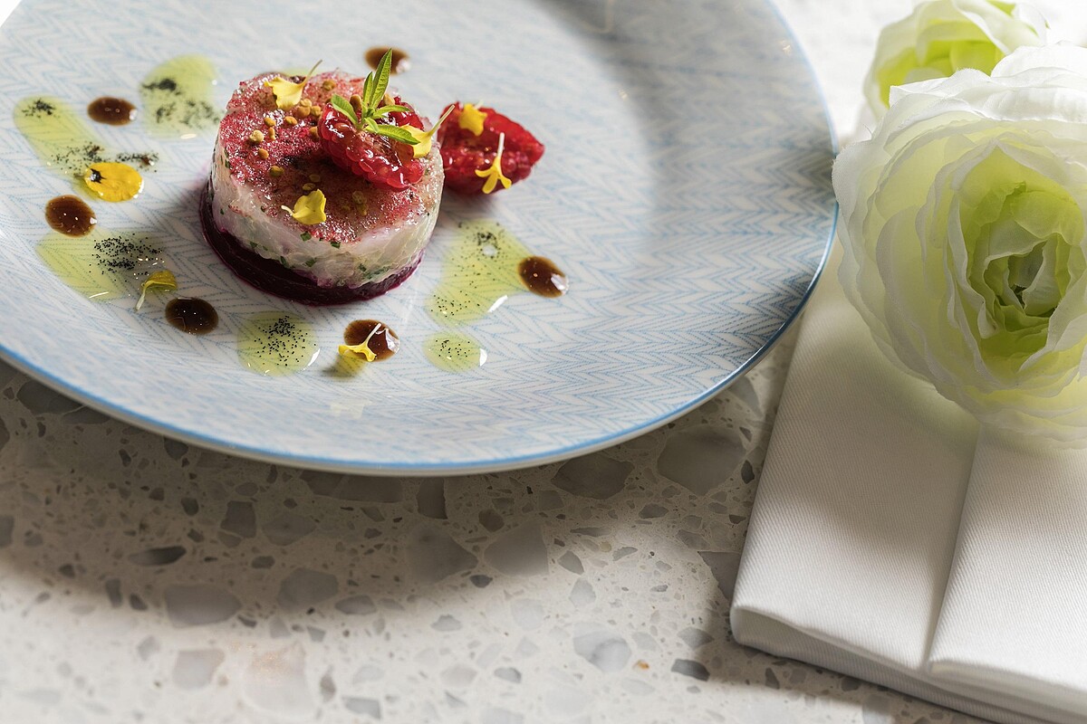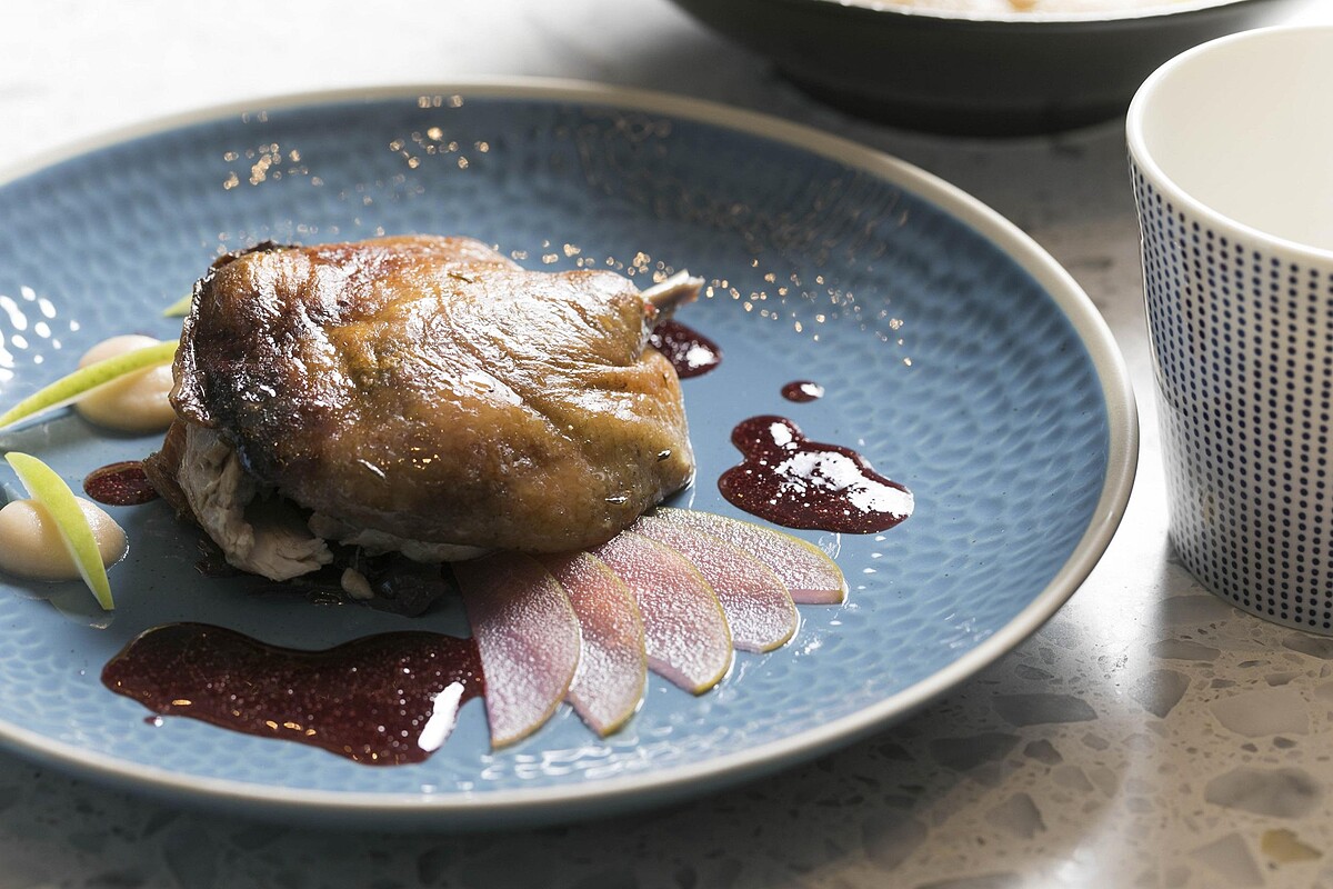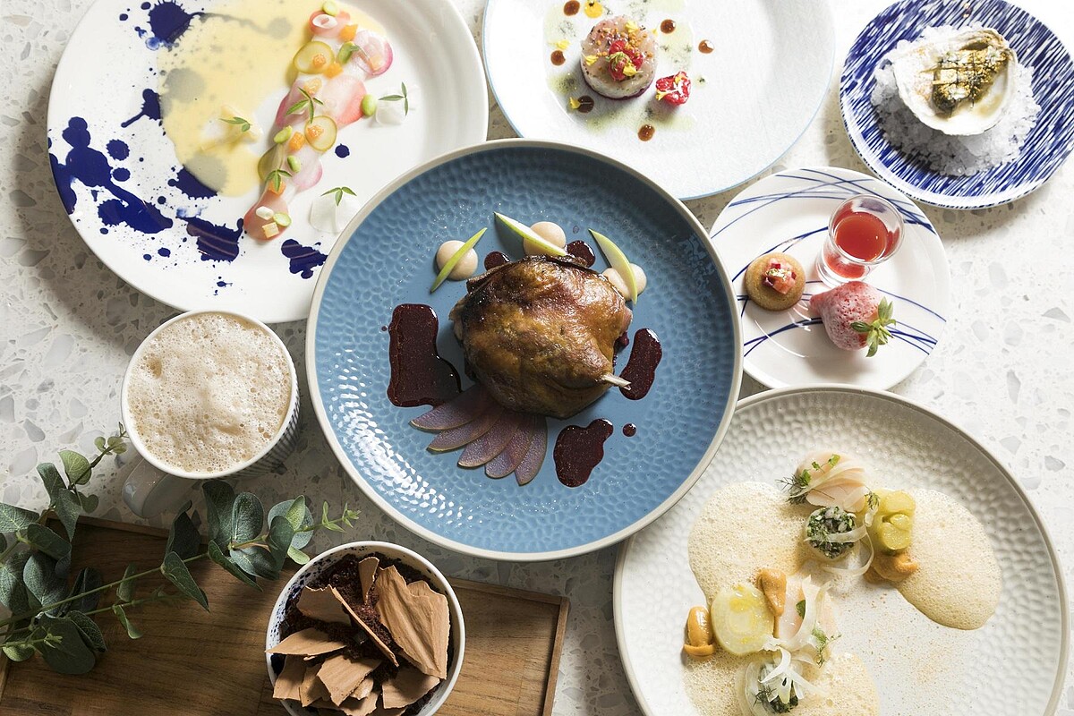 前菜北海道干貝/海膽/茴香,以半熟的干貝及海膽帶出海的鮮味,盛裝在Royal Doulton主廚聯名系列釉面起伏的典雅白平盤,感受漫步在沙灘的意象。剝皮魚/柑橘/毛豆/漬蘿蔔/萬壽菊,則是以醃漬蘿蔔、風乾水果並淋上綜合柑橘醬,更顯剝皮魚肉質鮮甜。主菜則是主廚的拿手好菜,油封鴨腿!這次特別選用台灣在地食材洛神花醬汁,皮酥脆肉軟嫩的鴨腿搭配洛神花紫高麗菜沾醬,佐義大利香醋醃製的青蘋果平衡油封鴨的口感,鮮嫩美味讓人驚艷不已。