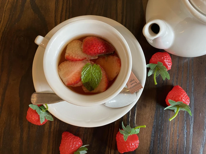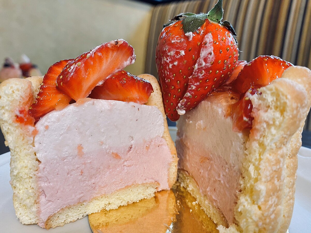 手指餅乾外側薄薄糖粉,帶來微脆糖霜口感,雙雙在口中化掉。大顆多汁的新鮮草莓,微微酸度配上奶香蛋黃餡,是大人小孩都喜歡的不敗款啦!